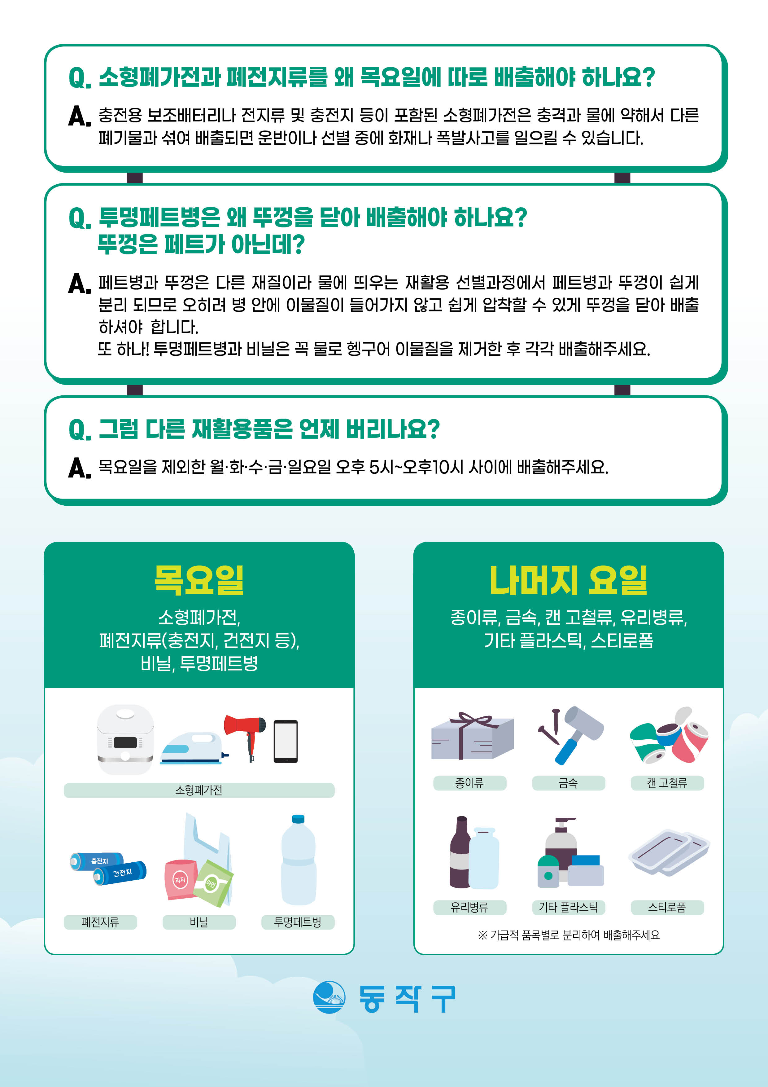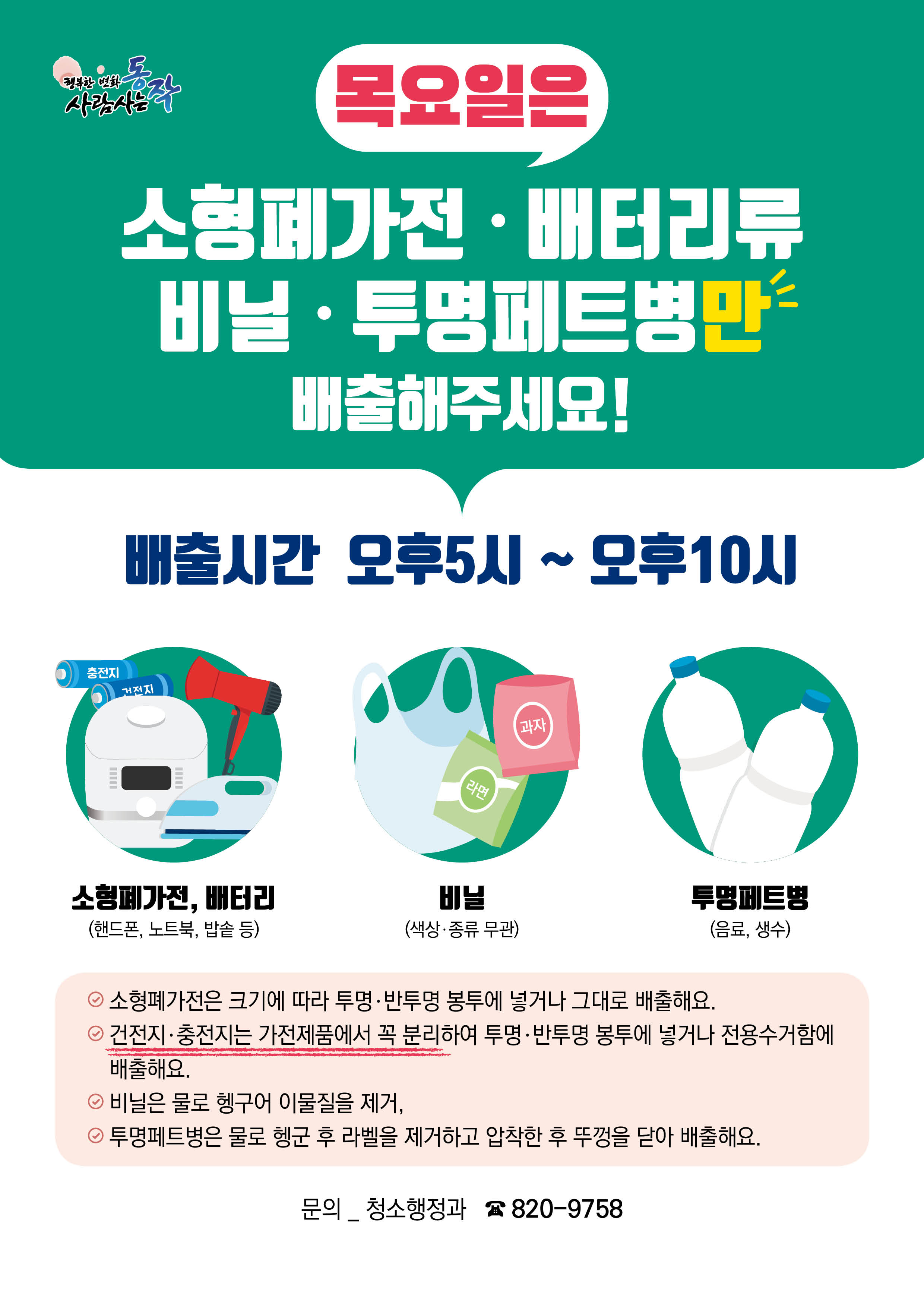 소형폐가전, 배터리류, 비닐, 투명페트병 배출안내