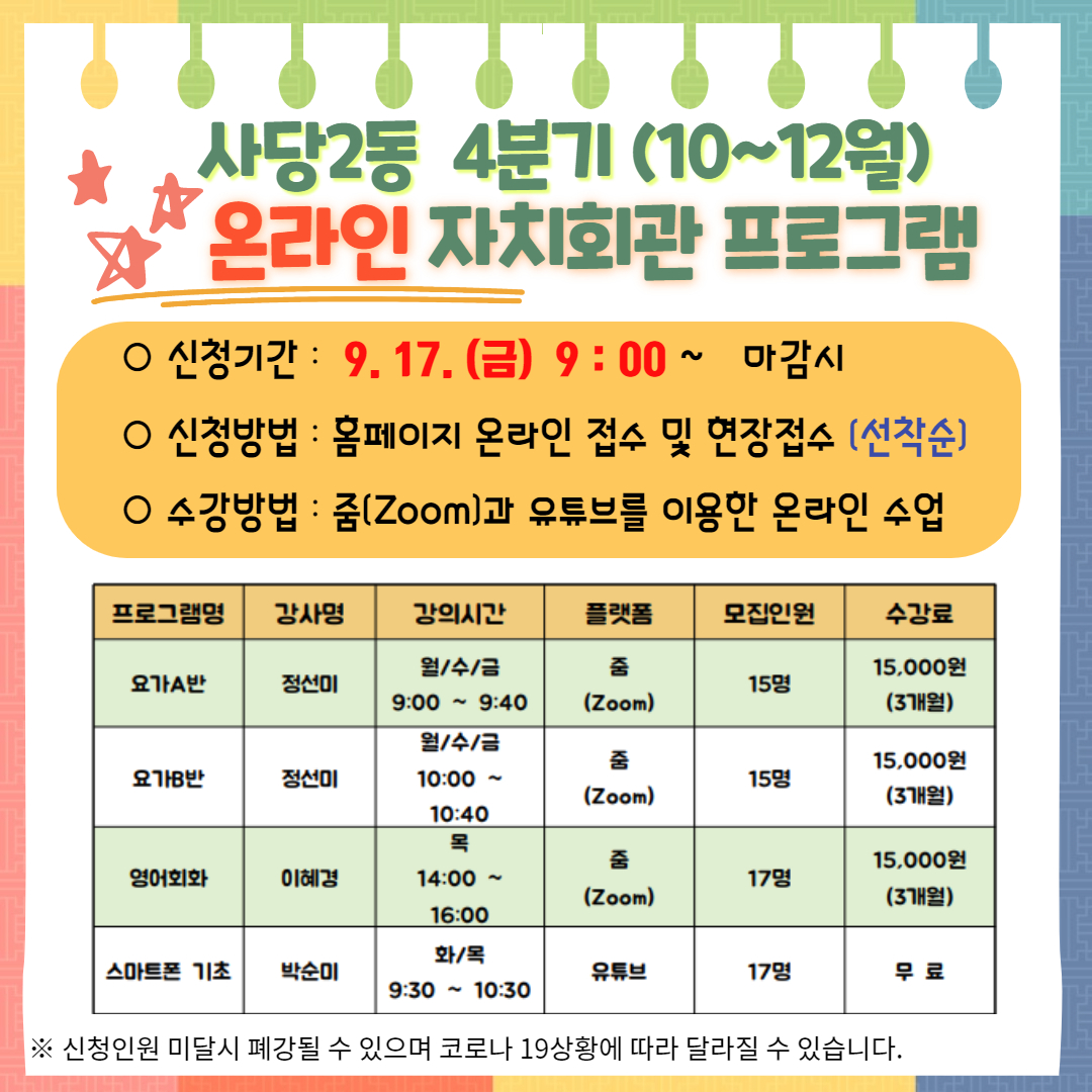2021년 4기 (10월~ 12월) 자치회관 프로그램을 안내드립니다.