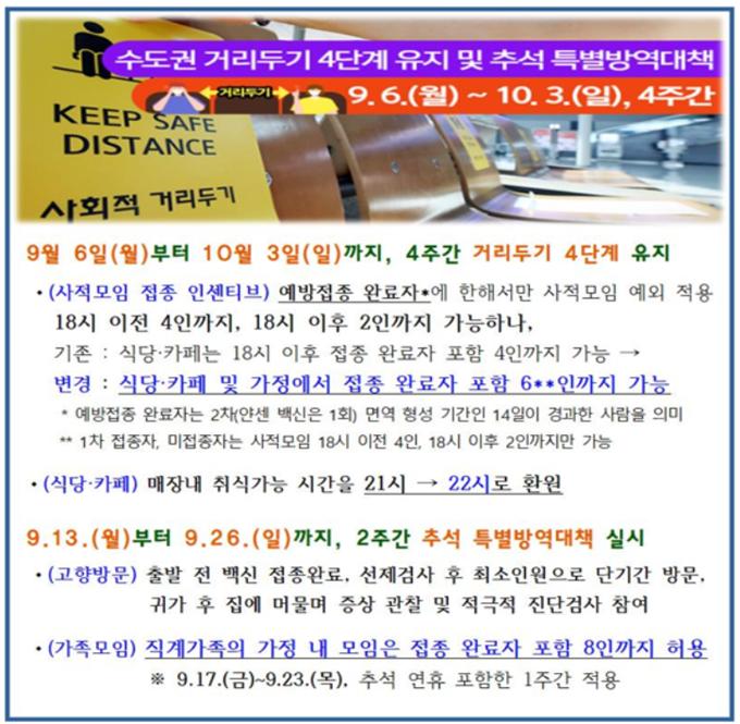 수도권 거리두기 4단계 연장 - 9. 6(월) ~ 10. 3(일) 안내