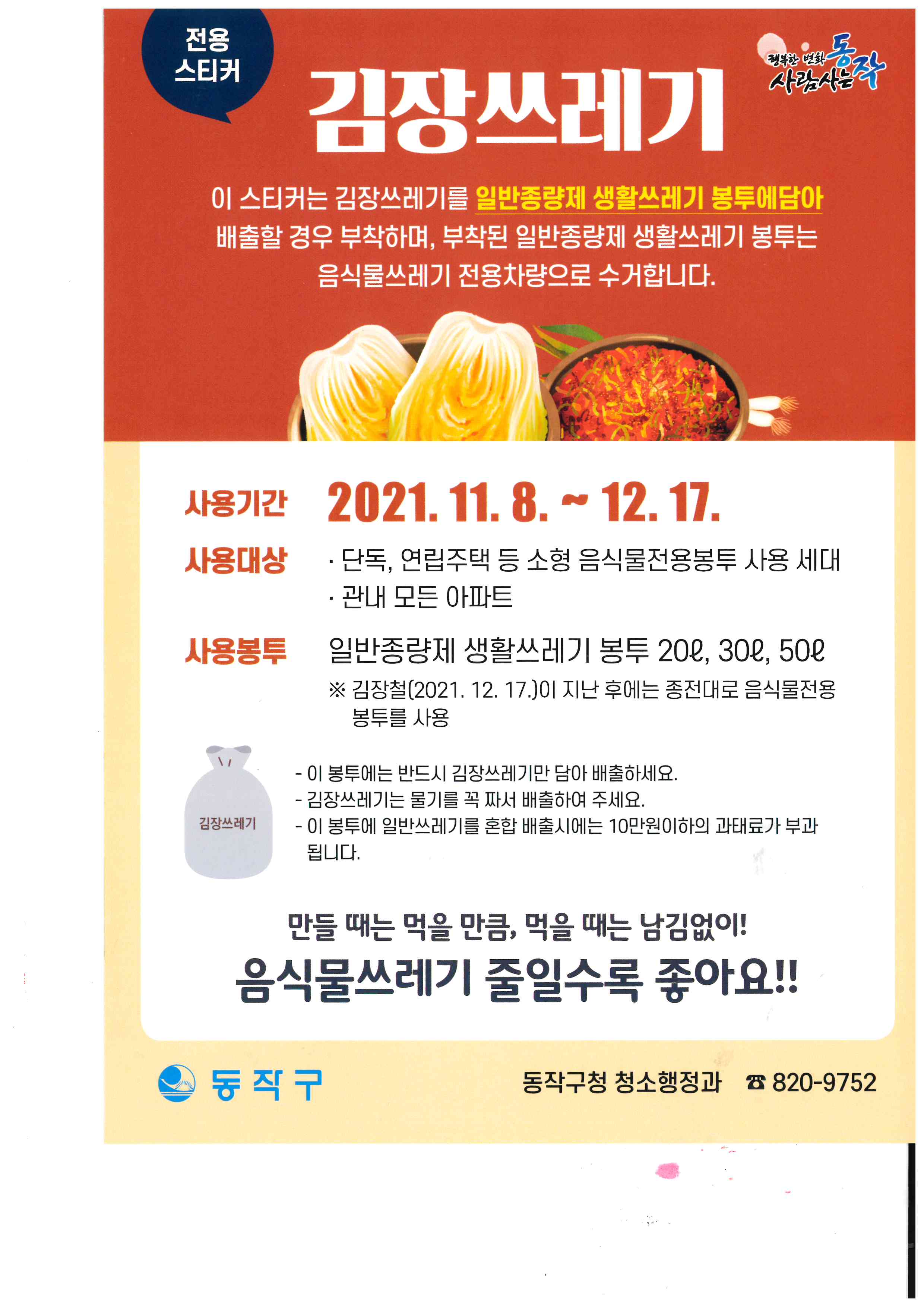 김장쓰레기 전용 스티커 부착 배출 안내(2021. 11. 8.~12. 17.)