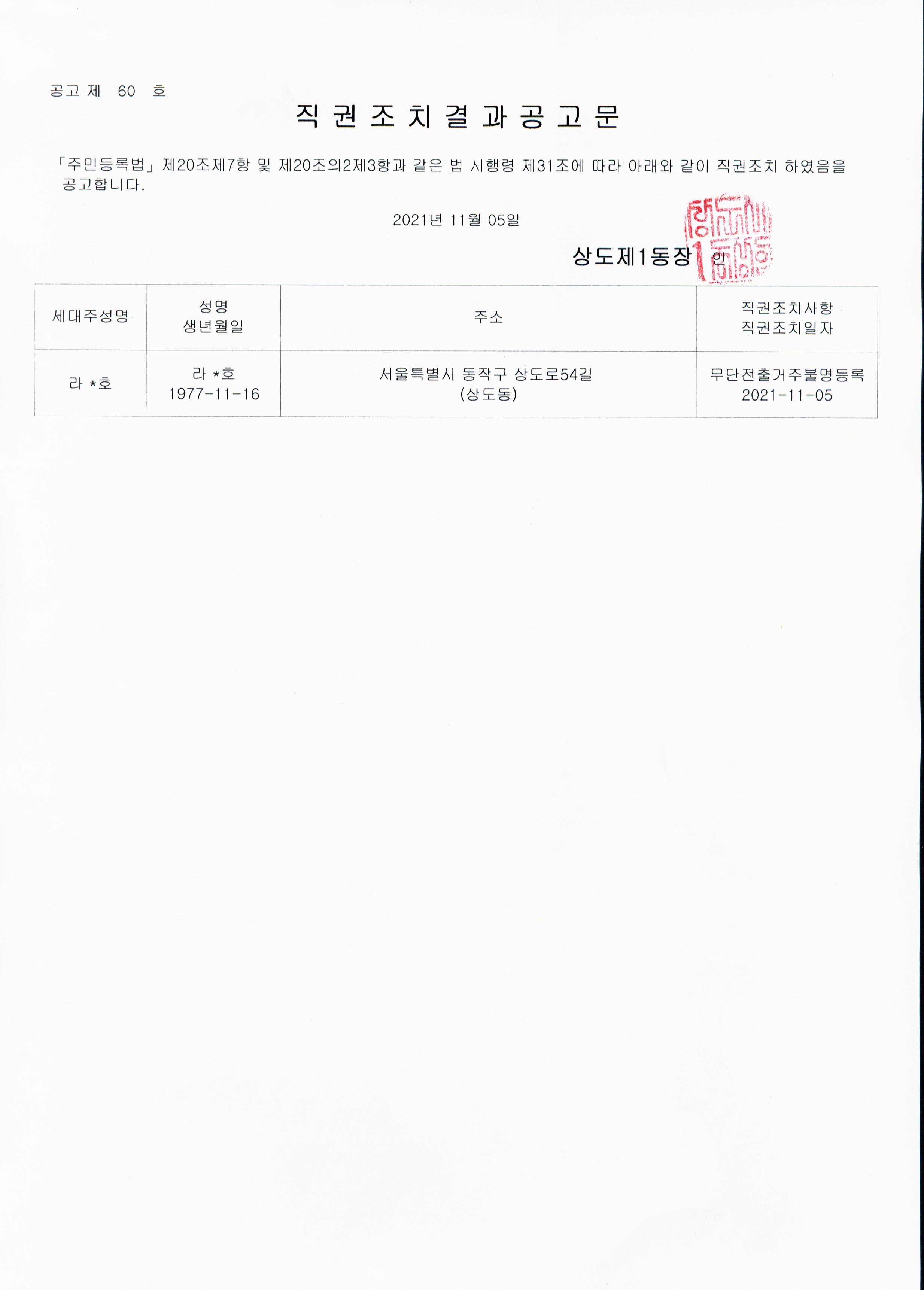 주민등록 직권조치 및 직권조치결과 공고(라*호)