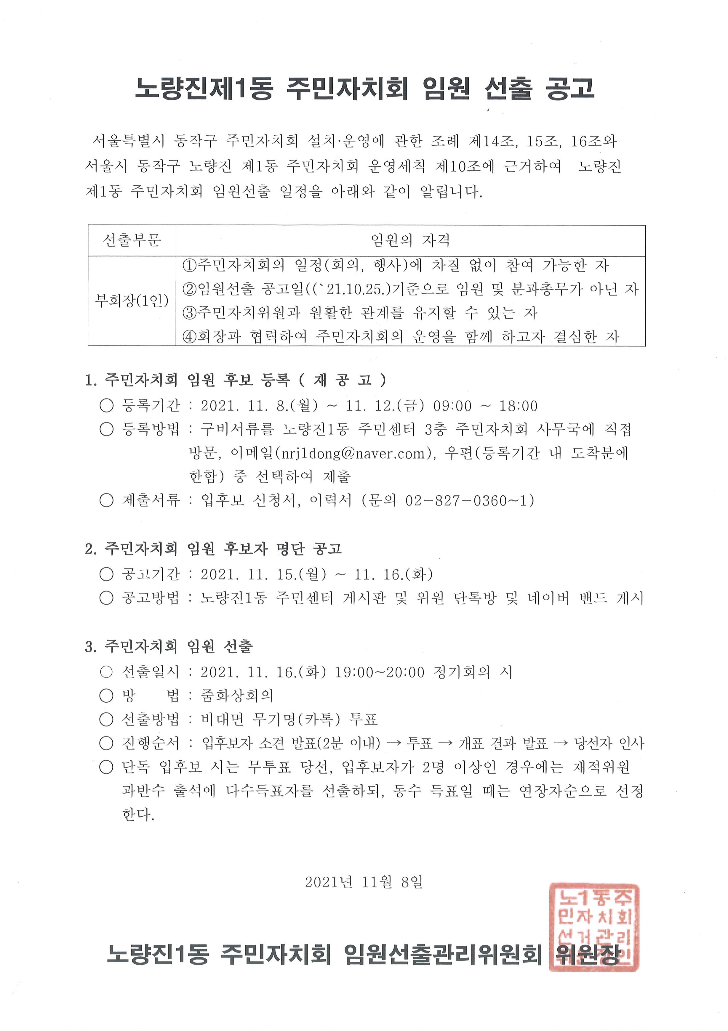노량진1동 주민자치회 임원(부회장) 선출 재공고