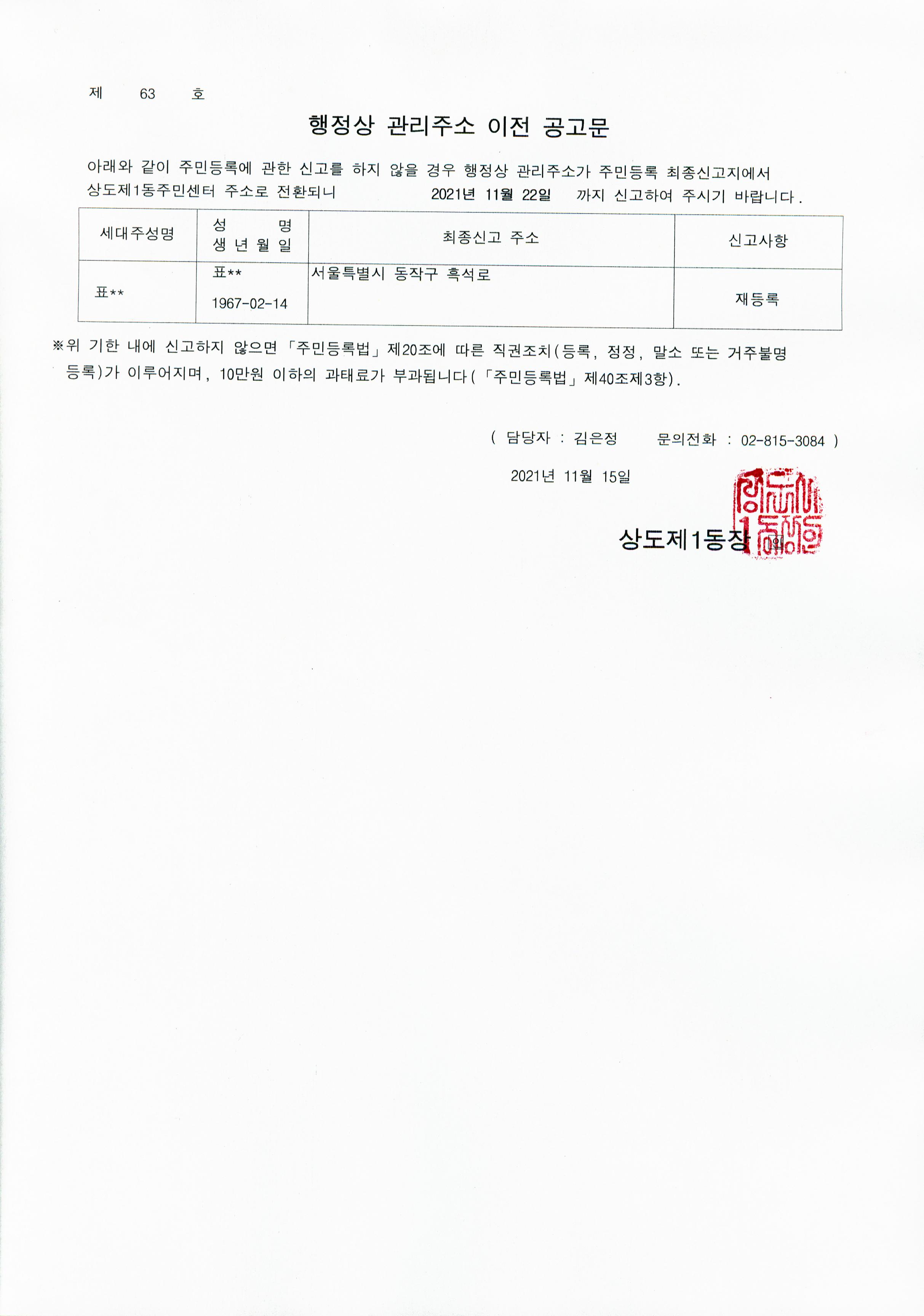 주민등록 거주불명등록자 행정상 관리주소 이전2차 공고
