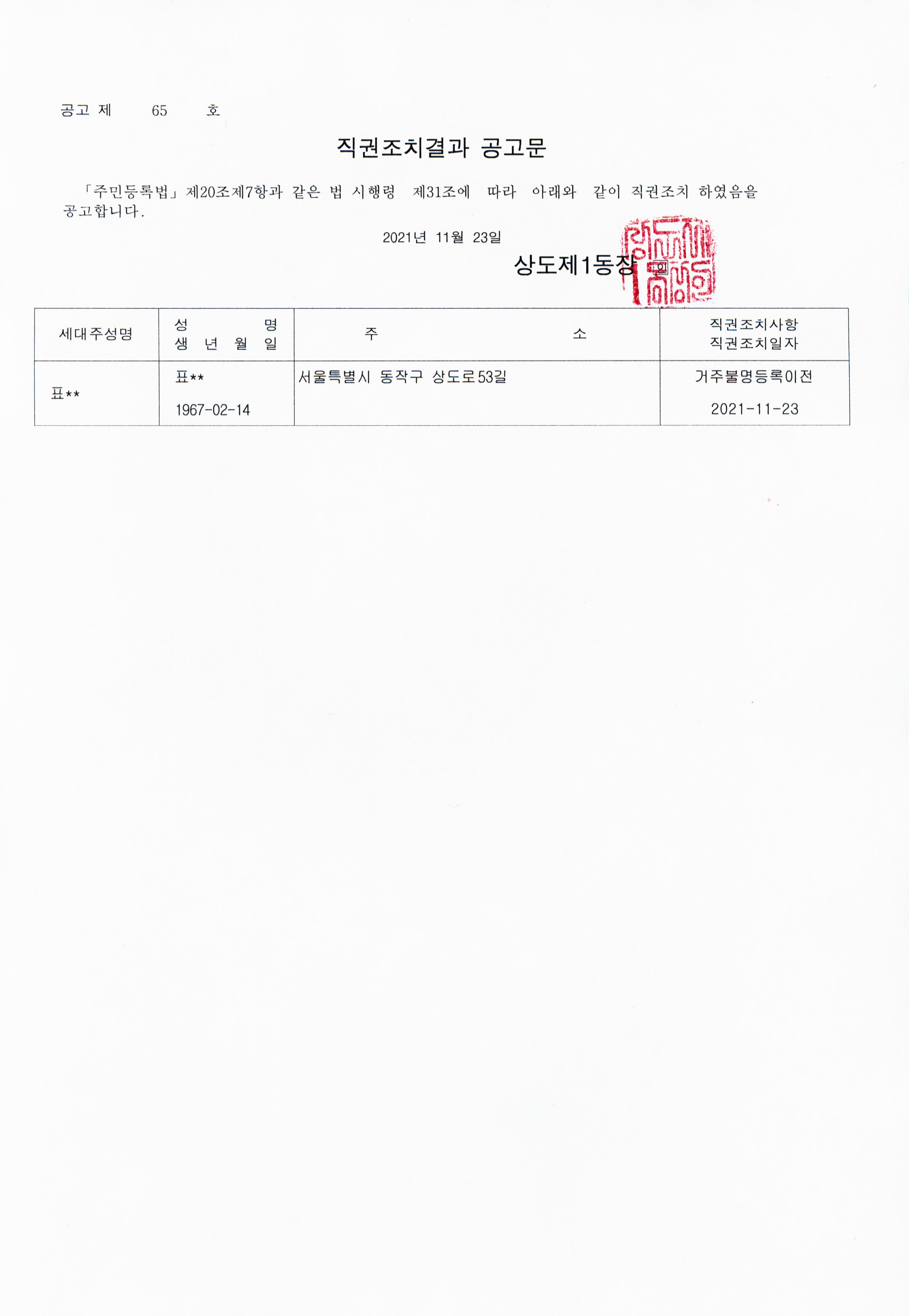 주민등록 거주불명등록자 행정상관리주소 이전 및 직권조치결과 공고