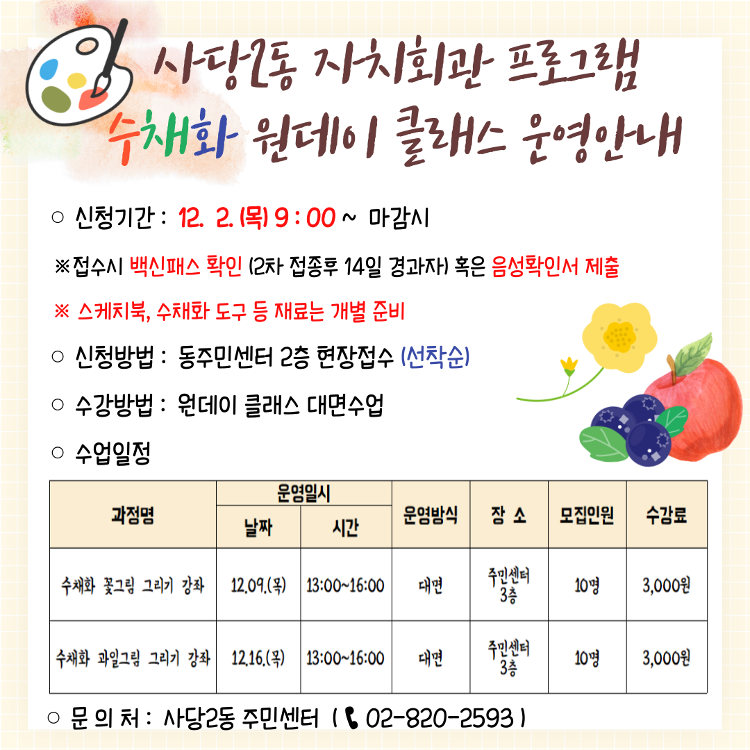 사당2동 자치회관 수채화 원데이 클래스 운영안내