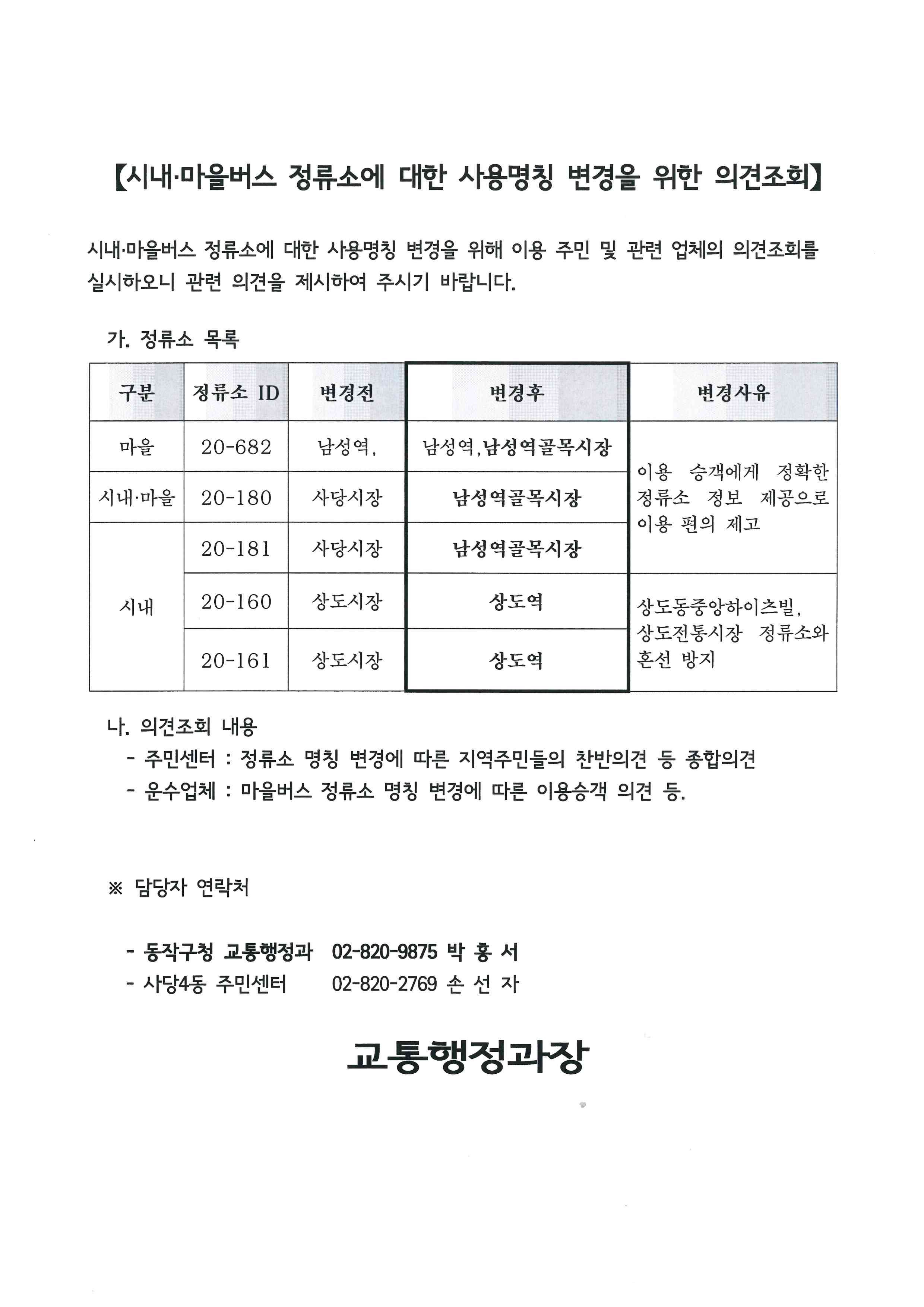 시내,마을버스 정류소에 대한 사용명칭 변경을 위한 의견조회