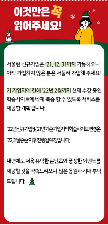 ※’21.12.31.까지 가입한 회원은 22.1.1.~22.2월까지 수강 중인 학습사이트에서 예‧복습 가능