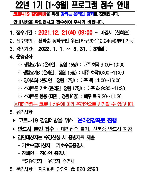 2022년 1분기(1월~3월) 자치회관 프로그램 접수안내