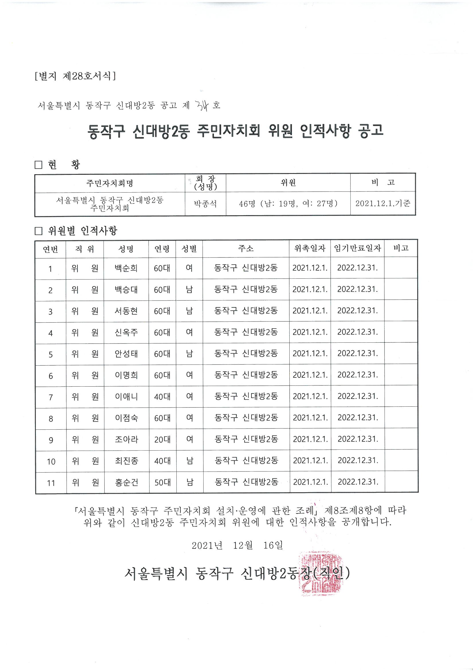 신대방2동 주민자치회 위원 인적사항 공고
