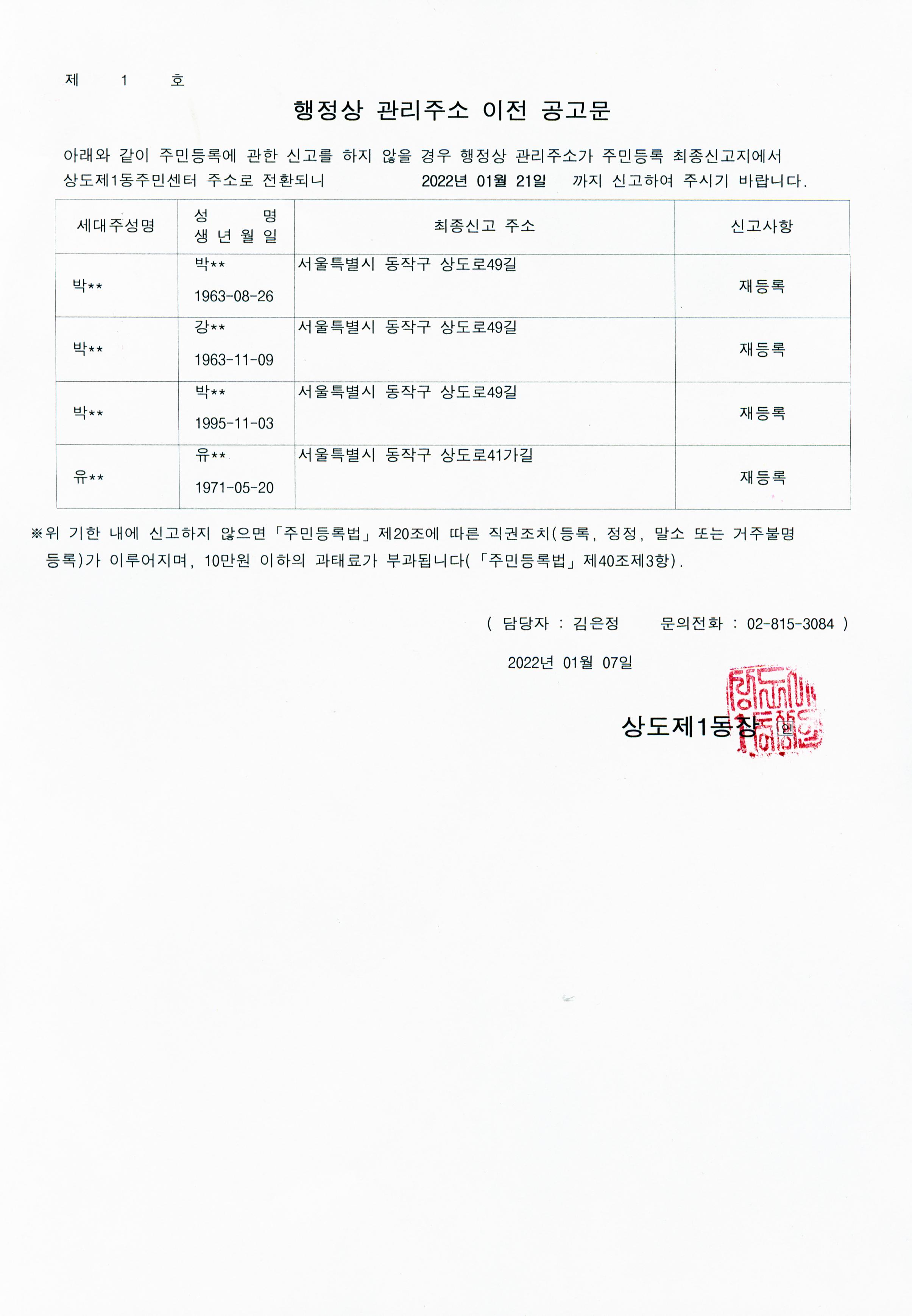 주민등록 거주불명등록자 행정상 관리주소이전 1차공고