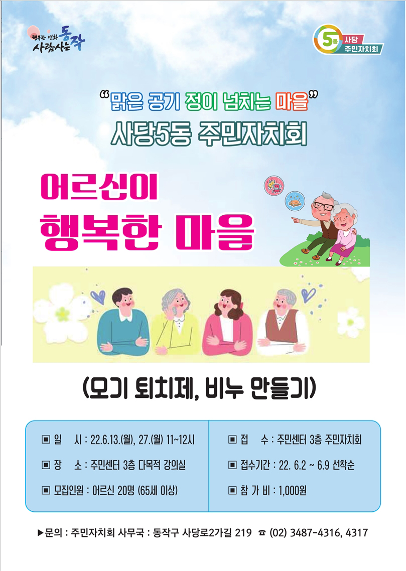 사당5동 주민자치회에서 65세 이상 어르신들 대상으로 어르신이 행복한 마을 프로그램을 진행합니다.