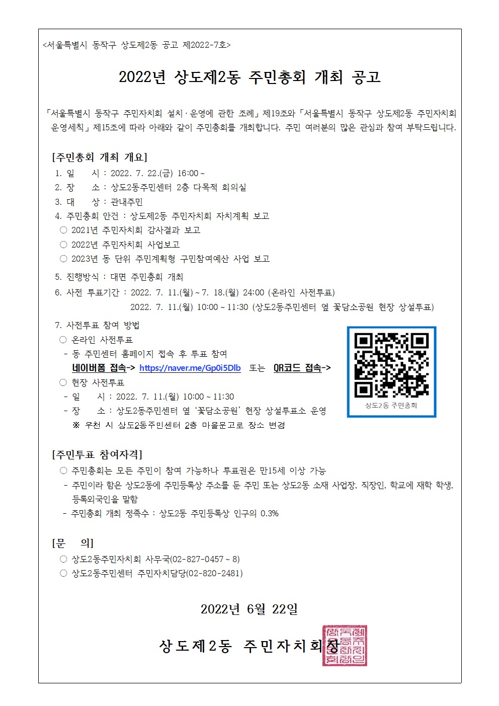 2022년 상도제2동 주민총회 개최 공고