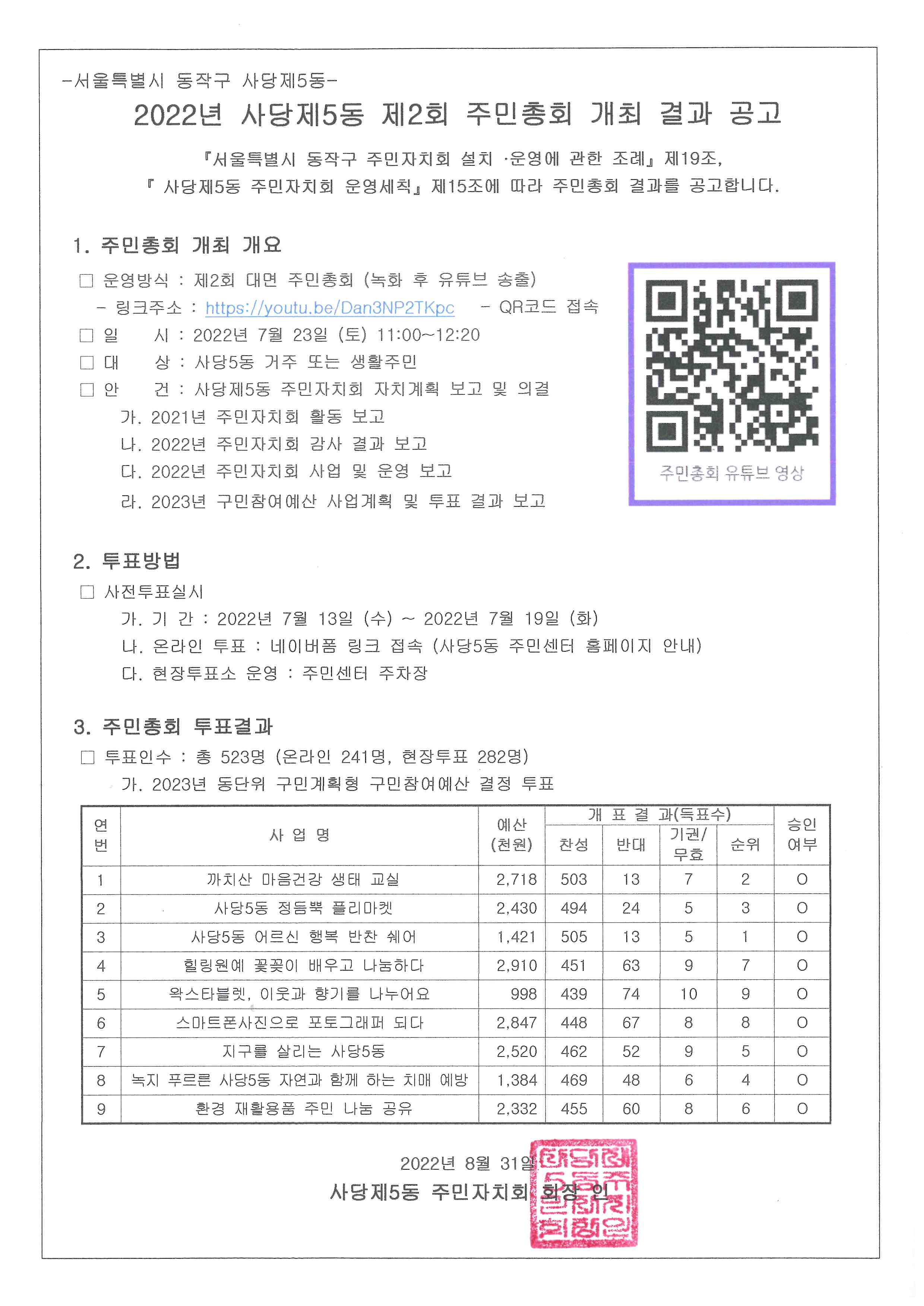2022년 사당제5동 제2회 주민총회 개최 결과 공고