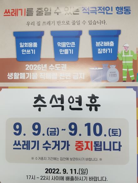 ○ 수거중지기간 : 2022. 9. 9.(금) ~ 9. 10.(토) [추석 : 9. 10.(토)]