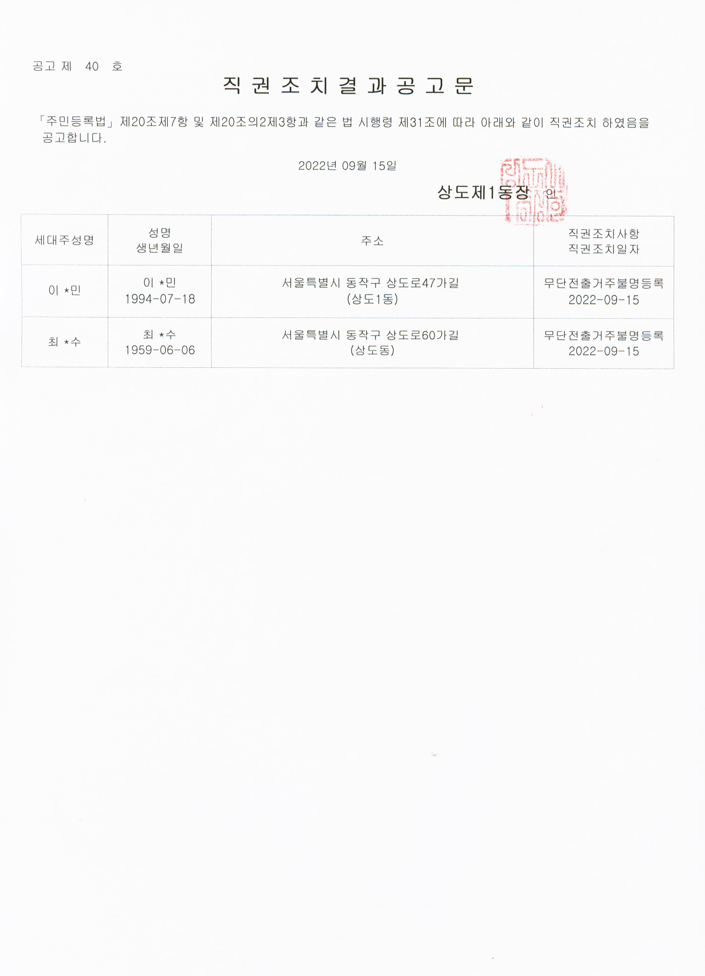 주민등록 직권조치 결과 공고
