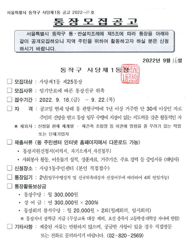 통장 모집 재공고(25통장)