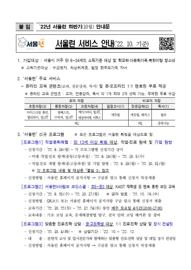 10월부터 신규가입 이벤트, 직업문화체험 프로그램, 서울런x아람코 코딩스쿨 등 다양한 신규 서비스가 시작됩니다.