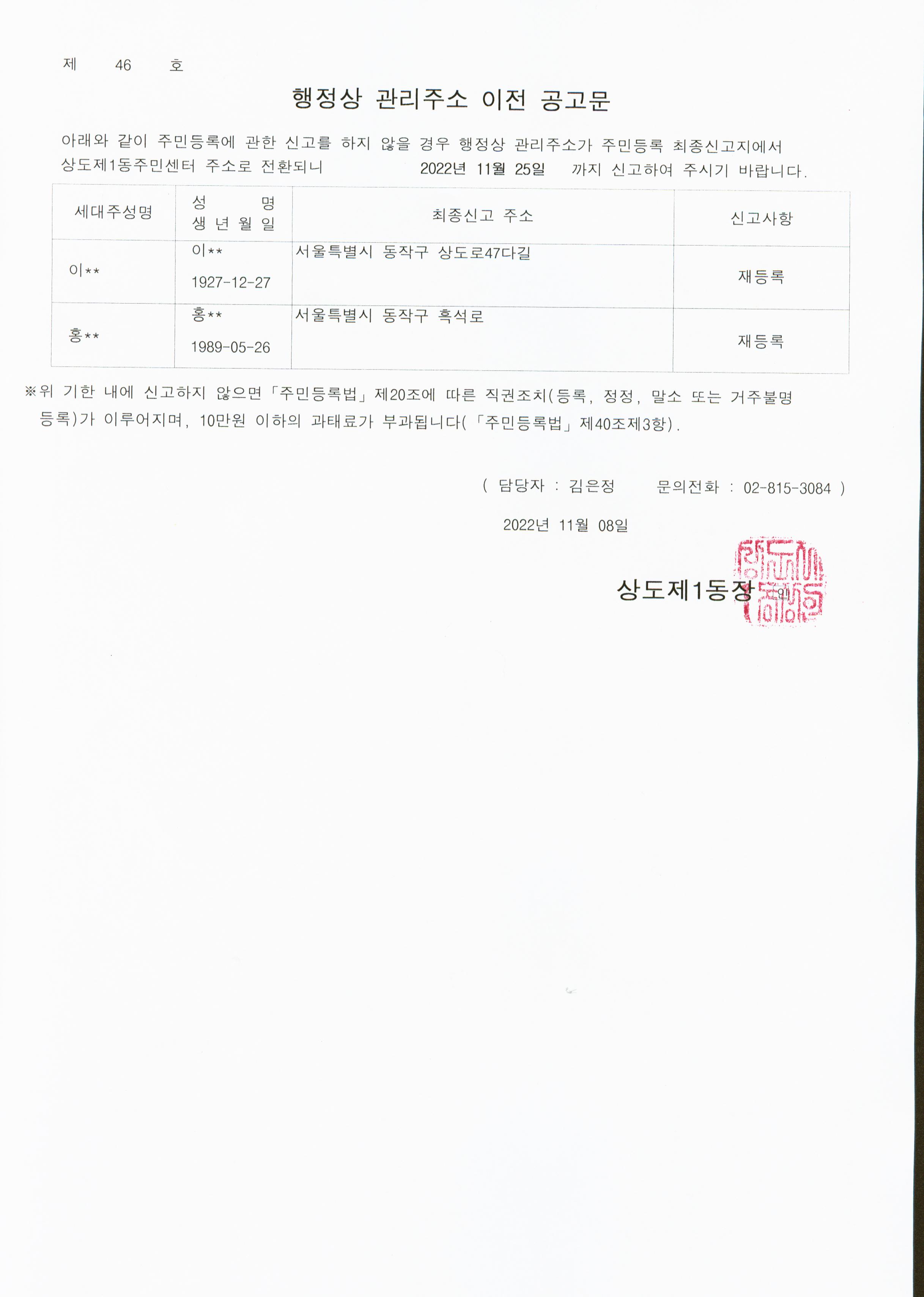 주민등록 거주불명자 행정상 관리주소 이전 공고2차