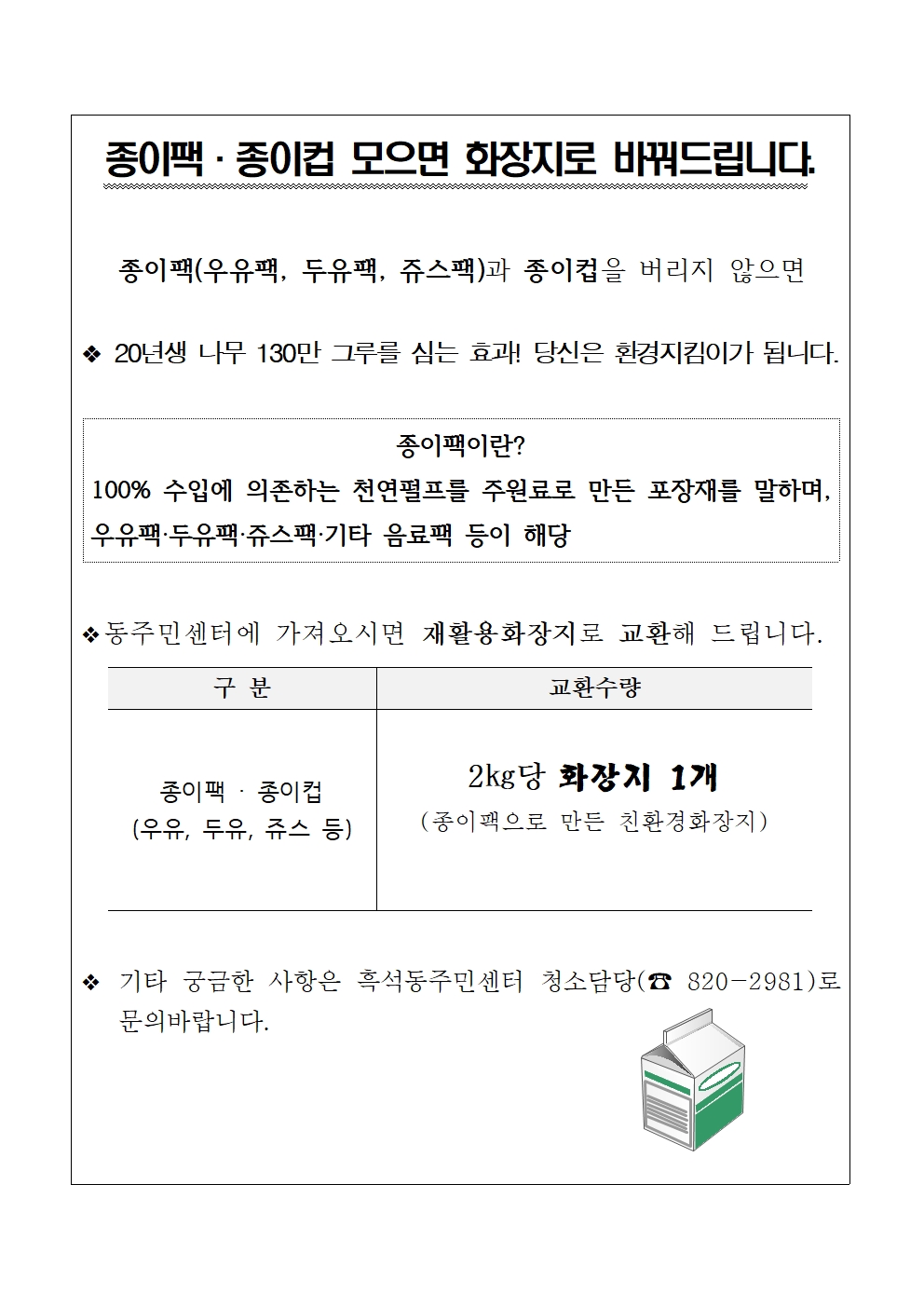 (청소) 종이팩·종이컵을 모아 오시면 화장지로 교환해 드립니다.