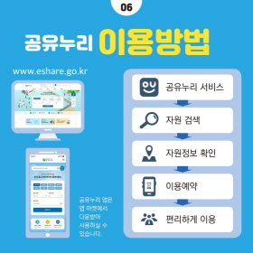 홈페이지(www.eshare.go.kr) 접속 및 공유누리 앱 다운→필요한 공유자원 검색→위치 등 공유자원 정보확인→공유자원 이용예약