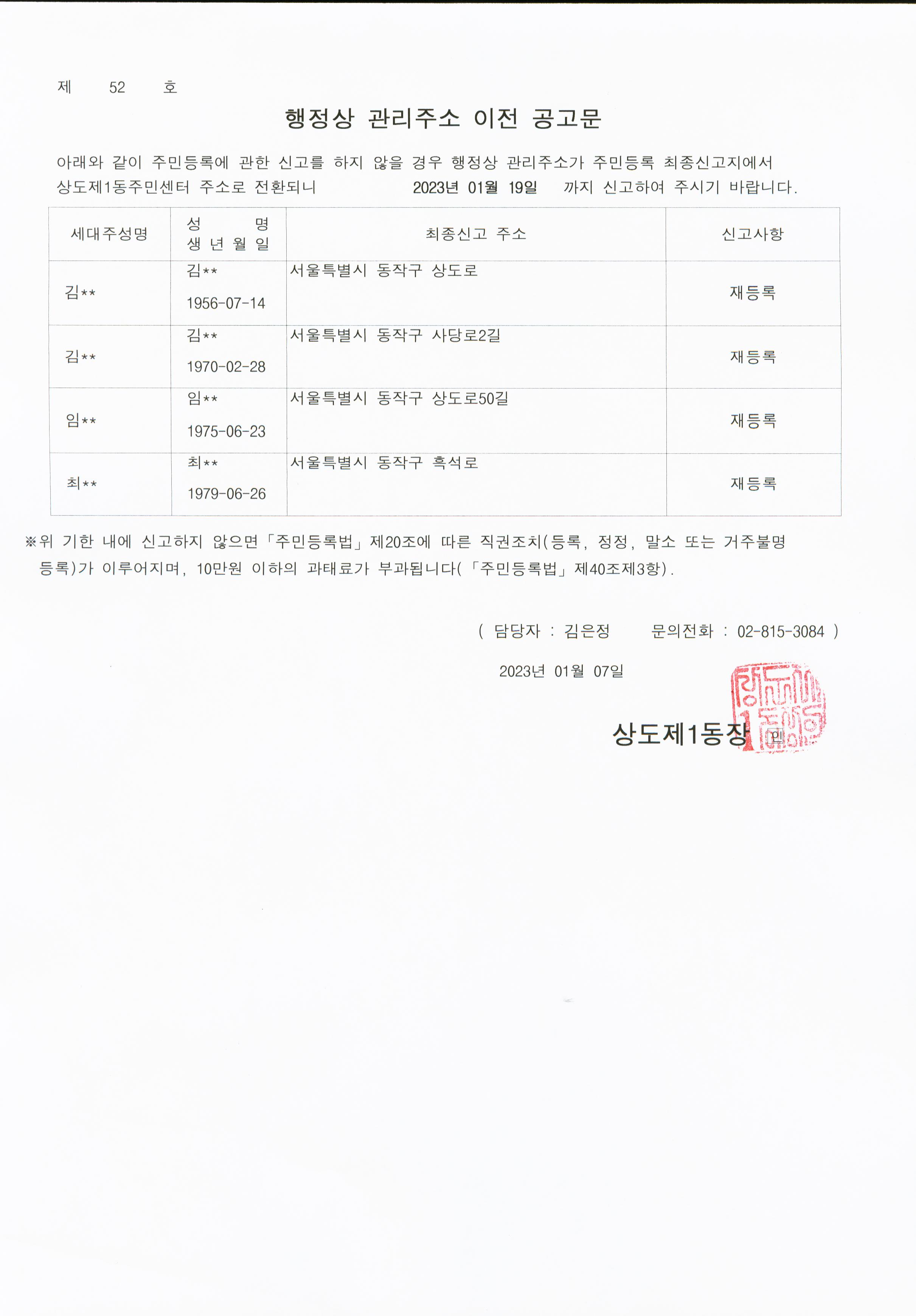 주민등록 거주불명자 행정상 관리주소 이전 공고 1차