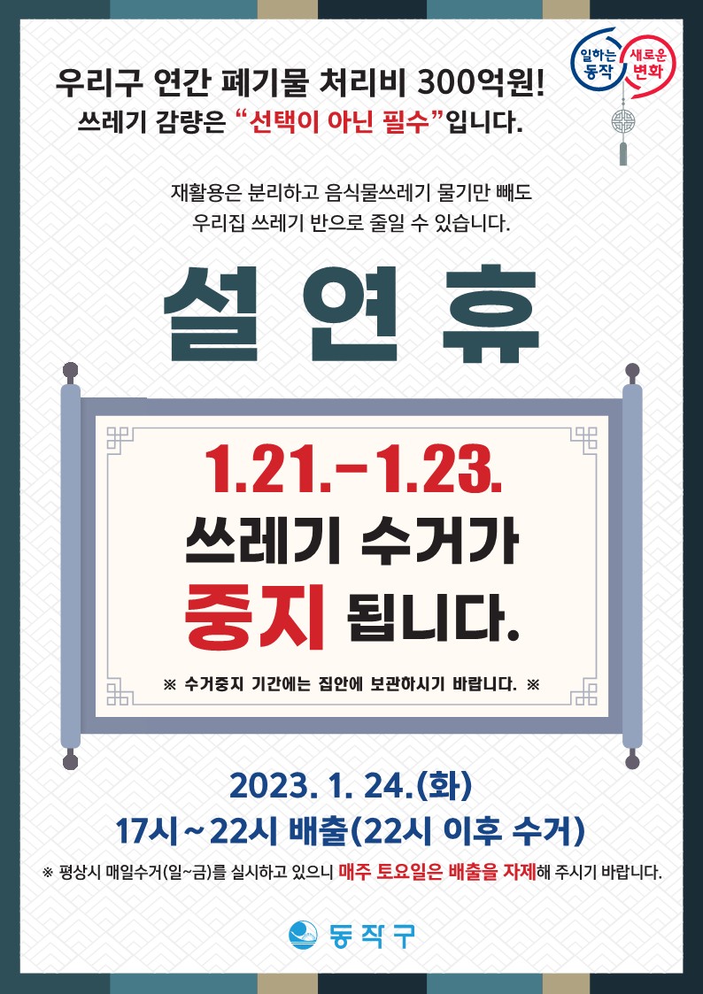 쓰레기 처리시설과 수거업체 휴무로 쓰레기 수거가 1.21.(토) ~ 1.23.(월) 까지 중지됩니다.