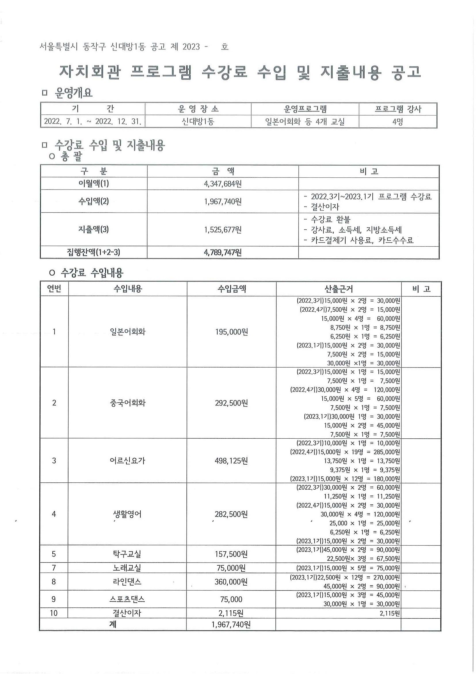 2022년 하반기 자치회관 프로그램 수강료 수입 및 지출내용 공고