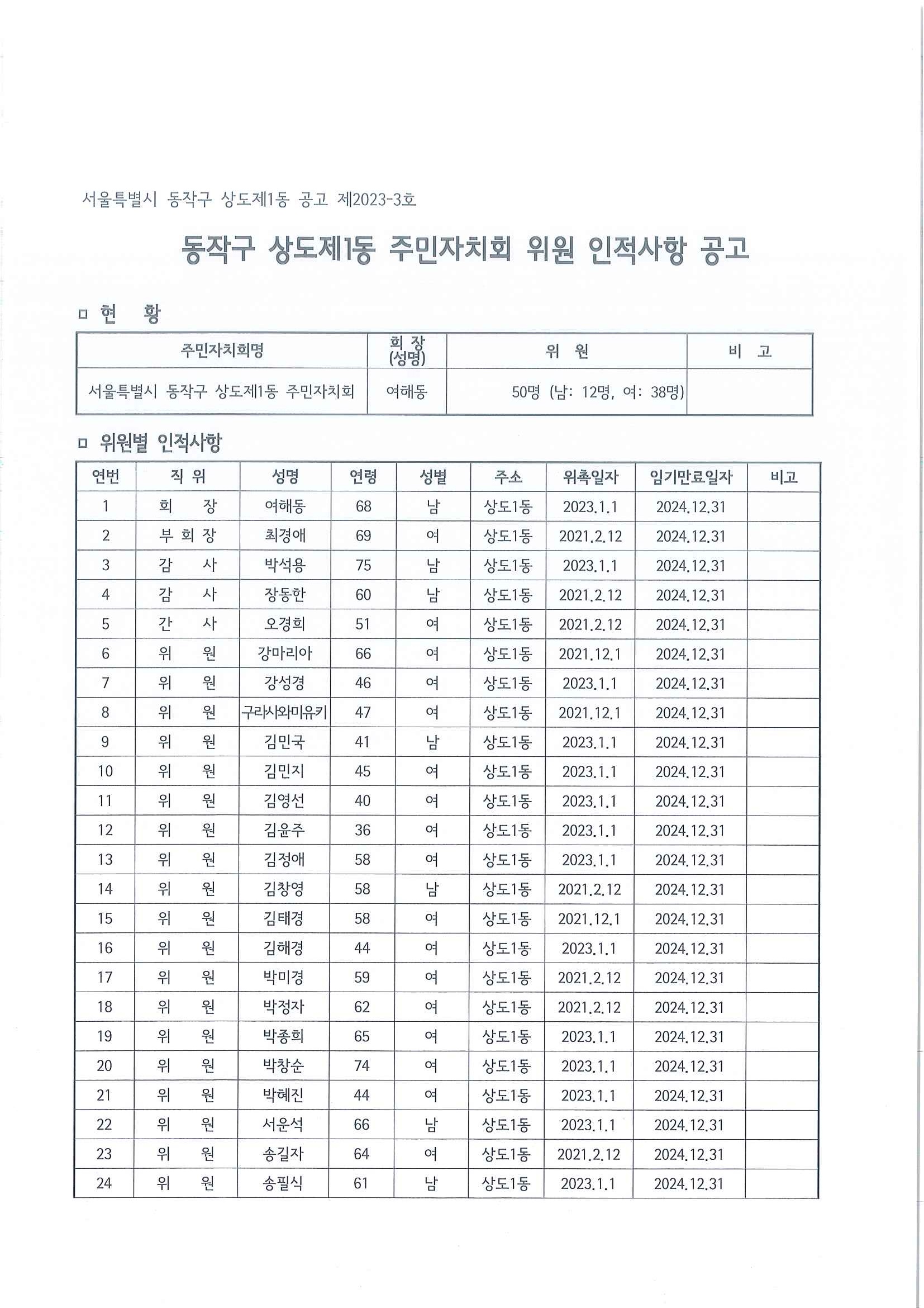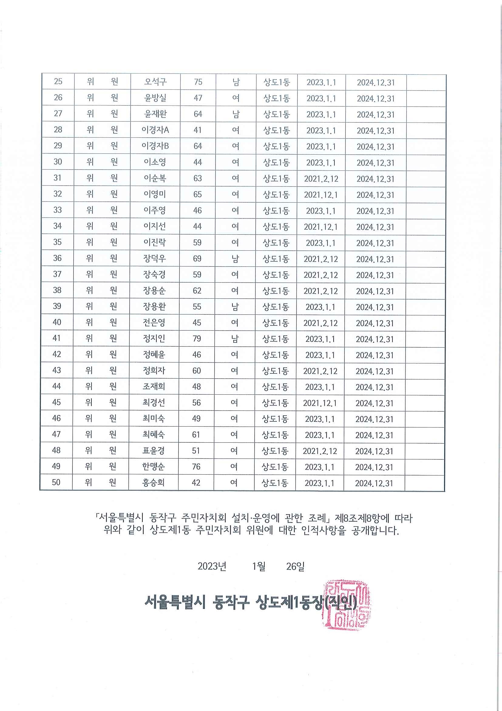 상도제1동 주민자치회 위원 인적사항 공고