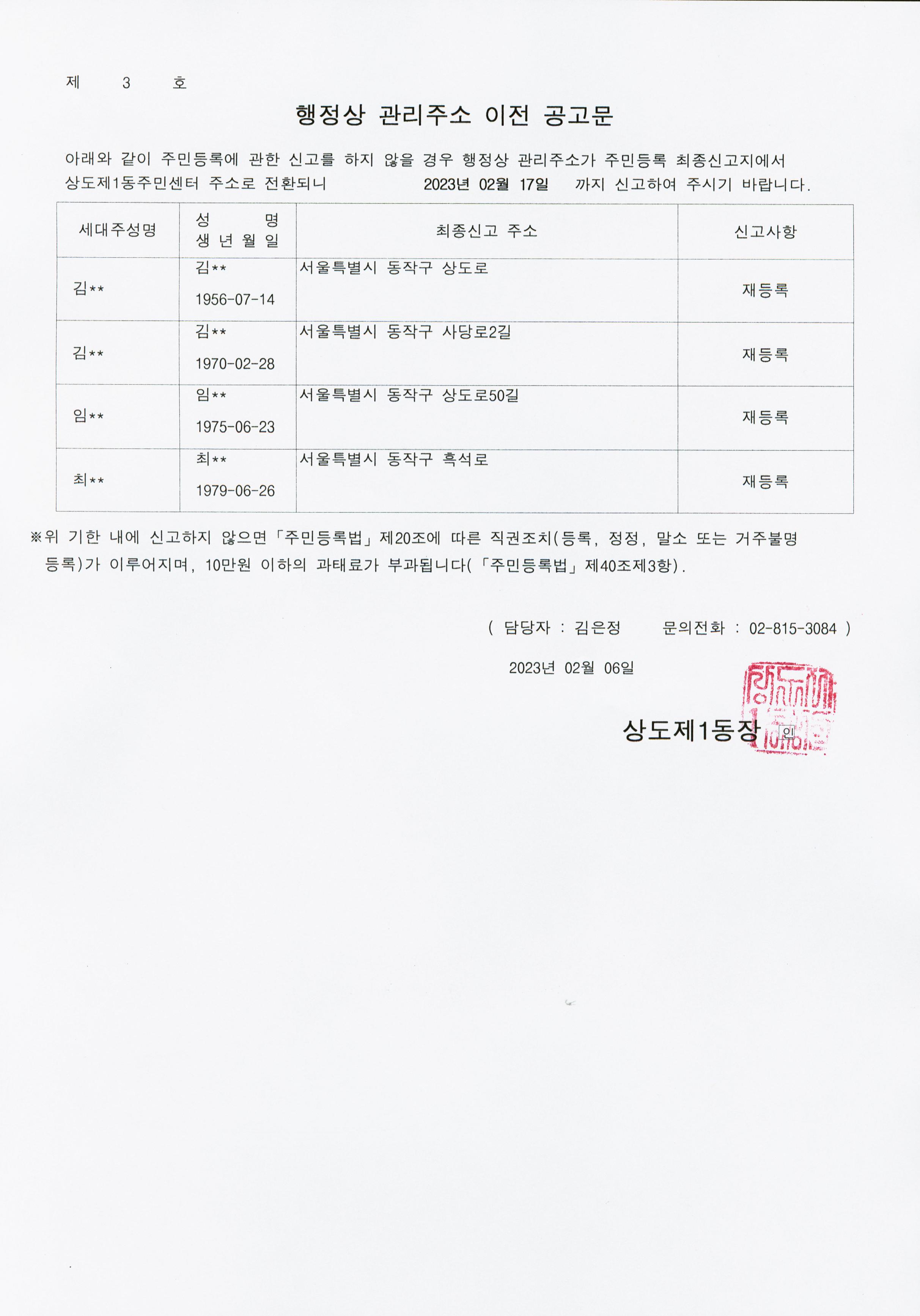 주민등록 거주불명자 행정상 관리주소 이전2차 공고