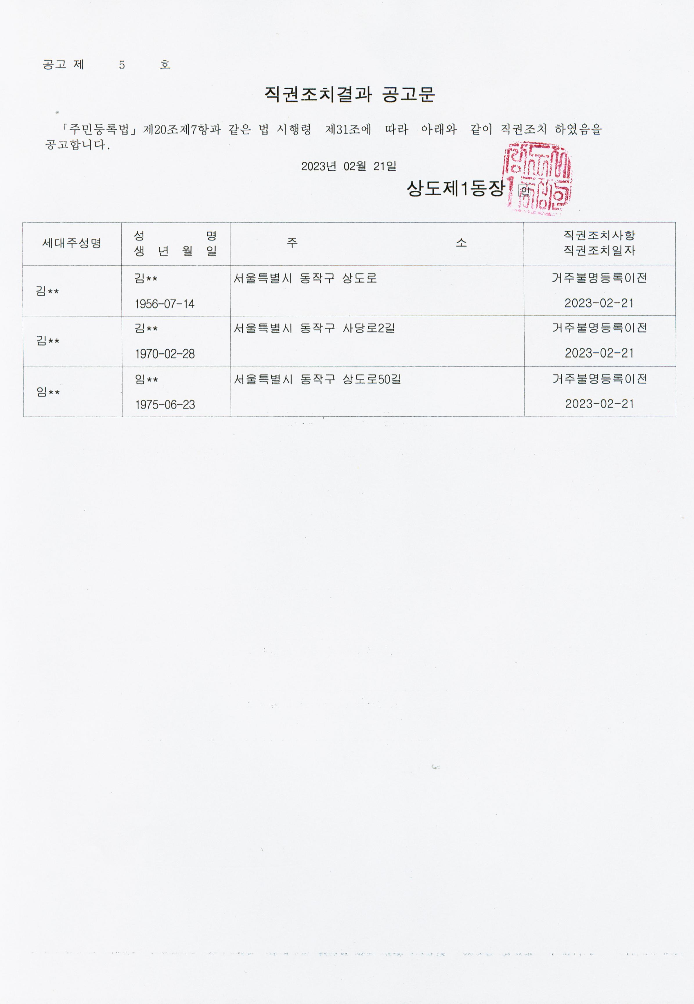 주민등록 거주불명자 행정상관리주소이전 및 직권조치결과 공고