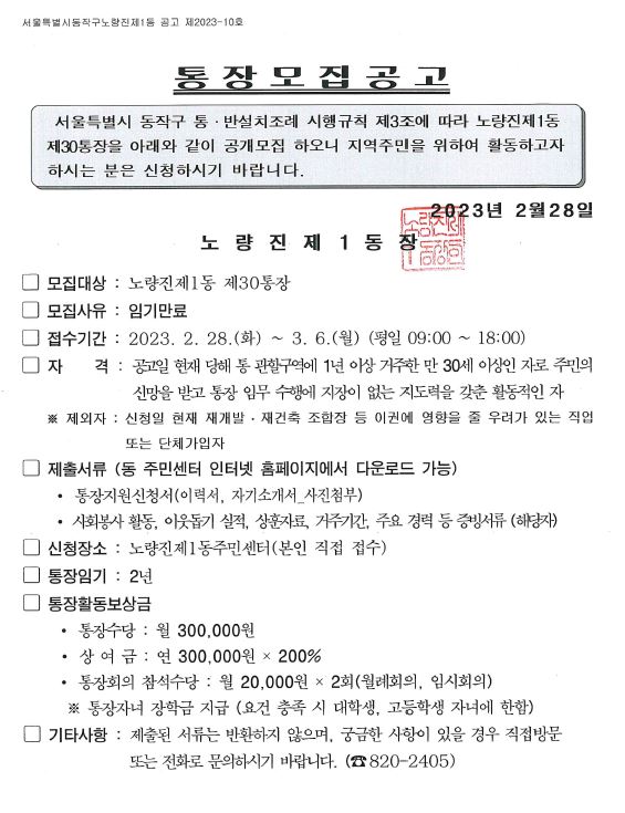 노량진1동 제30통장 모집공고