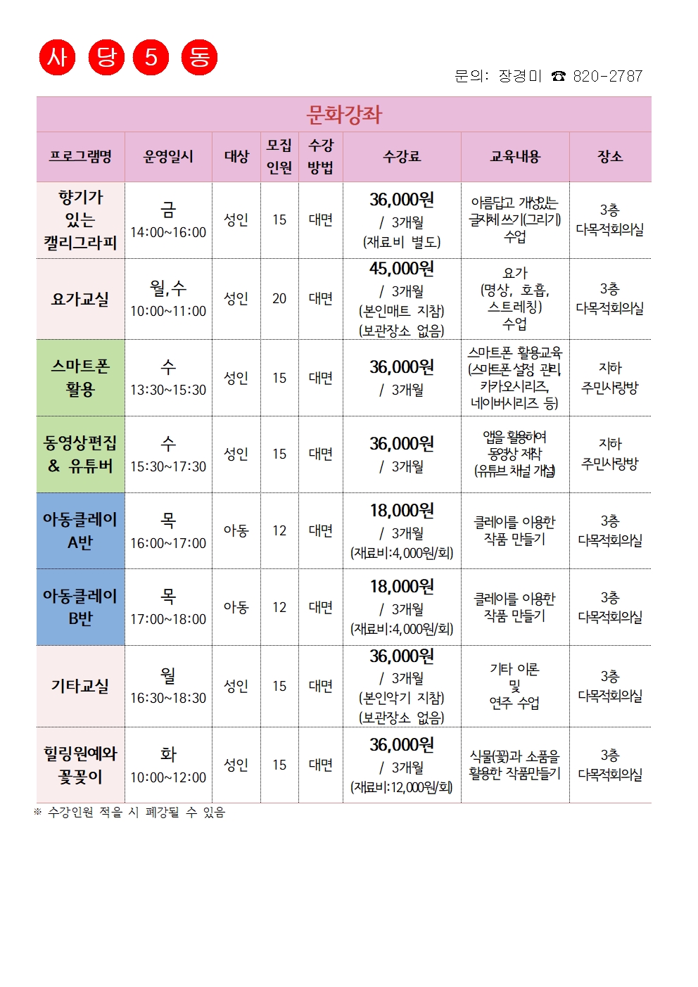 2023년 2기(4~6월) 사당5동 자치회관 프로그램 접수 안내