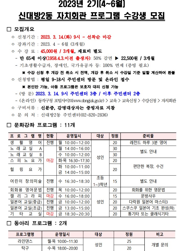 2023년 2기(4~6월) 신대방2동 자치회관 프로그램 수강생 모집