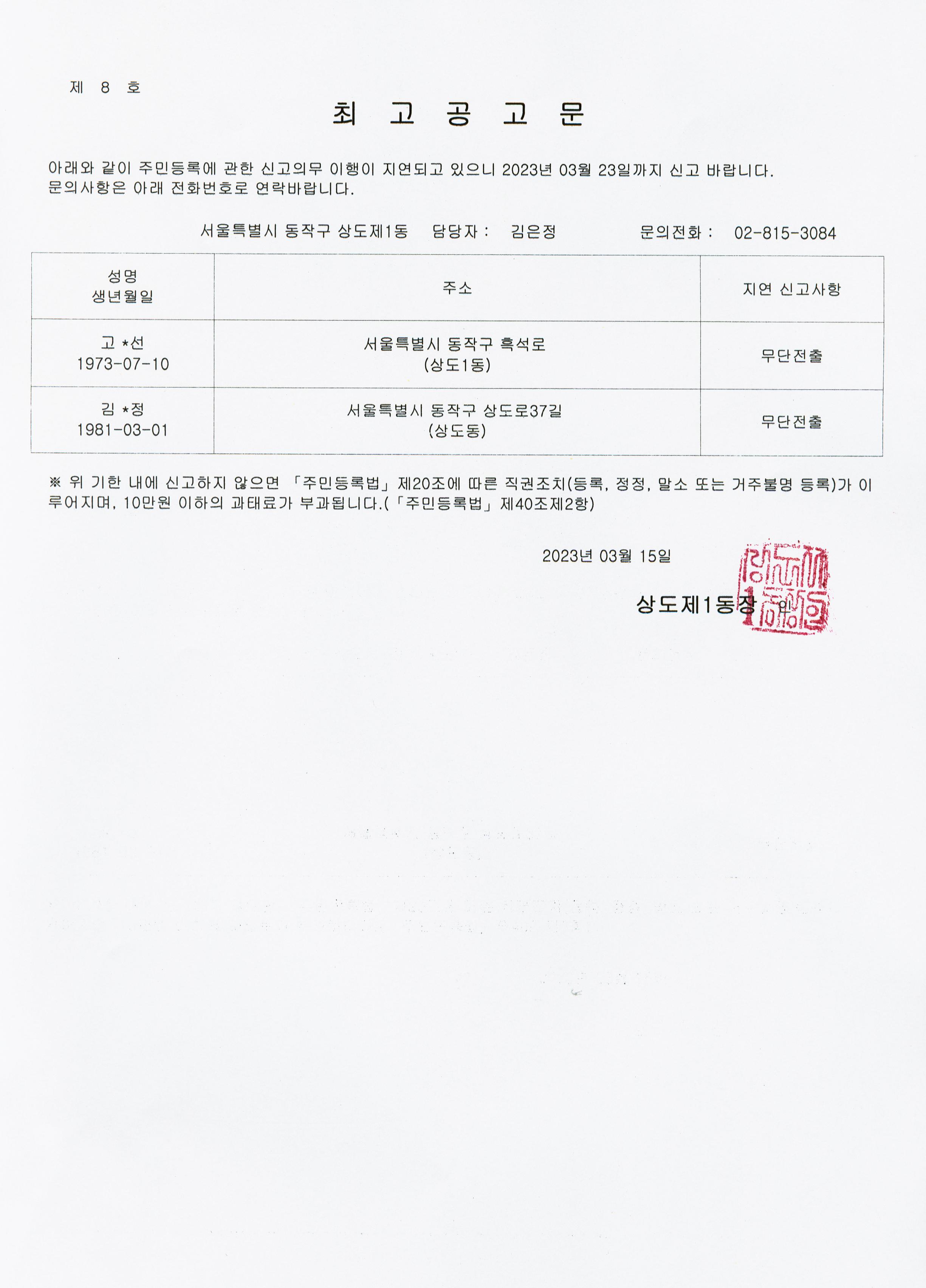 무단전출자 주민등록 최고 공고