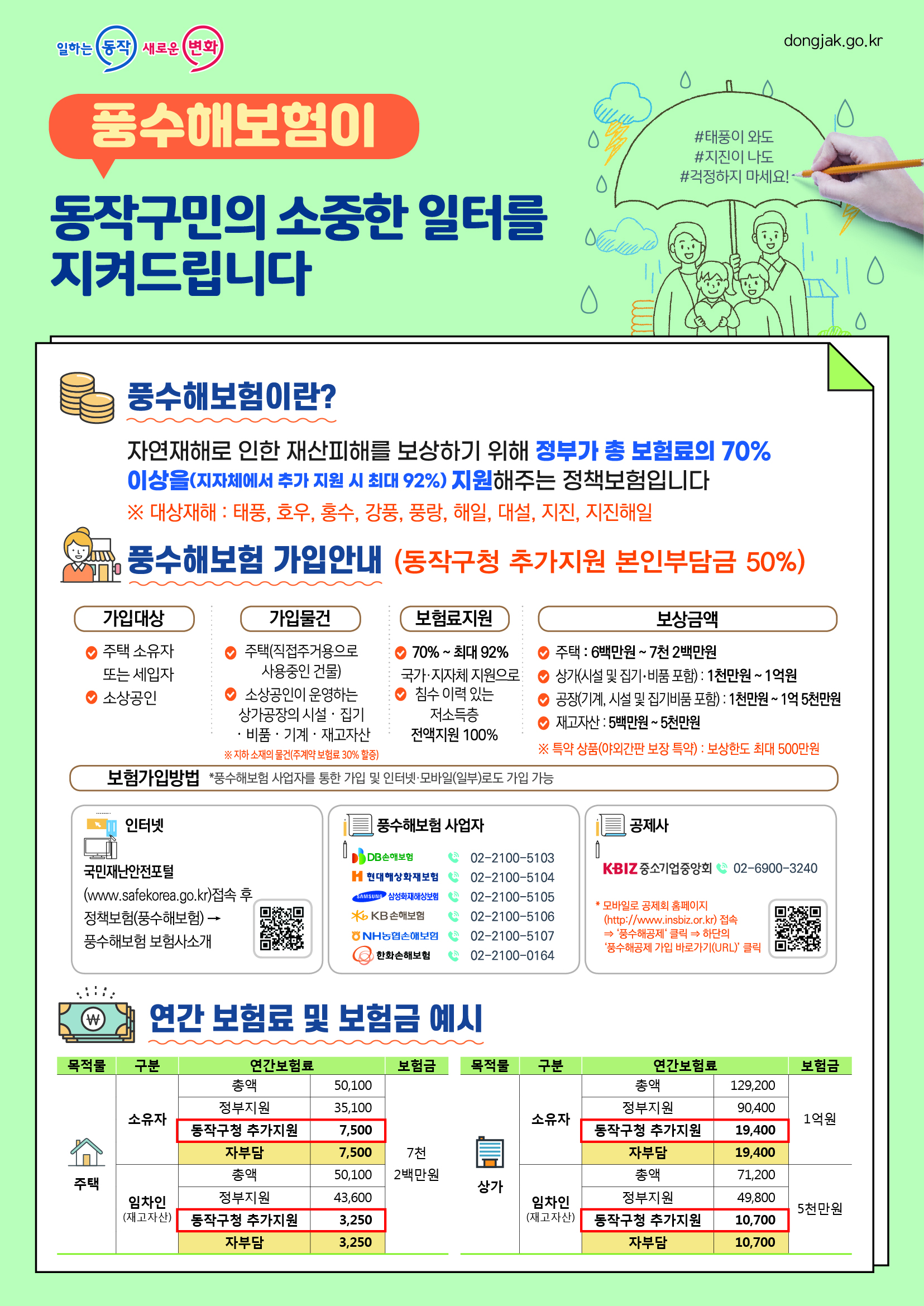 ‣풍수해보험료 지원 - 정부지원 70% - 개인부담 30% | ‣풍수해보험료 지원 - 정부지원 70% - 동작구청 추가지원 15% - 개인부담 15% ※ 풍수해보험료 동작구청 추가지원 한도 - 10만원 이내(주택) - 20만원 이내(소상공인) |