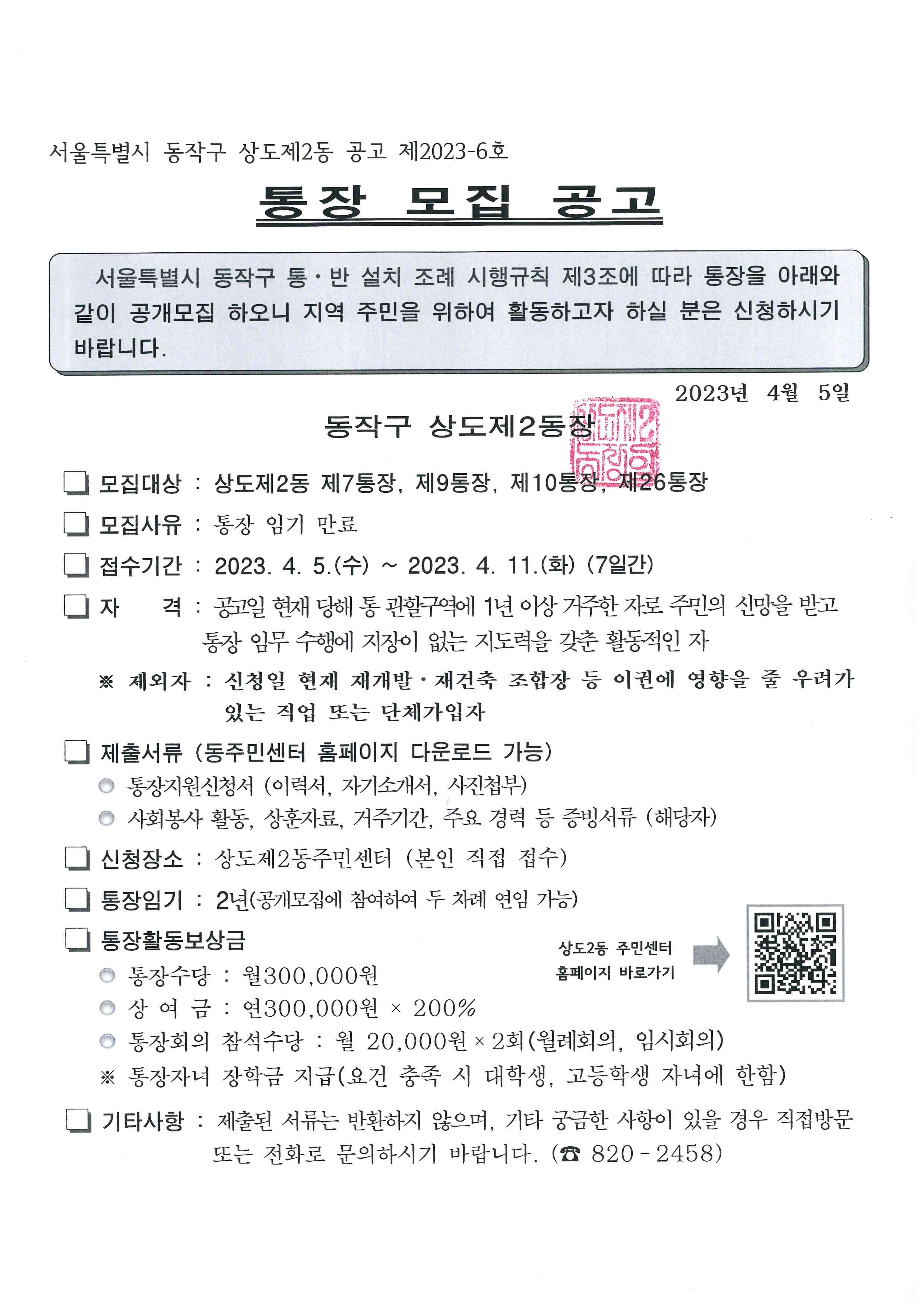 상도2동 통장 모집 공고 (7통, 9통, 10통, 26통)