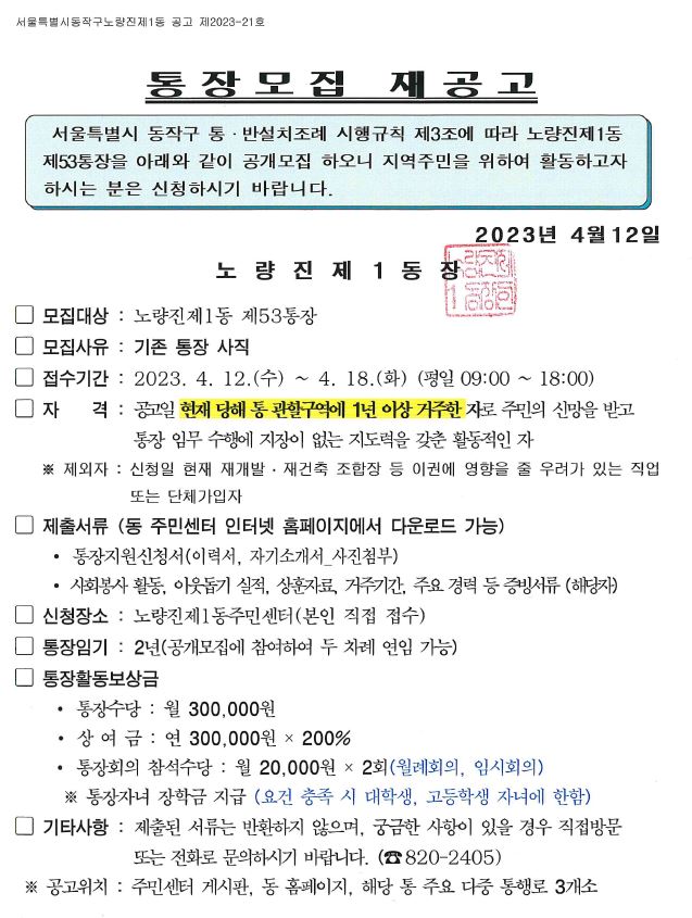 노량진1동 통장모집 재공고(53통)