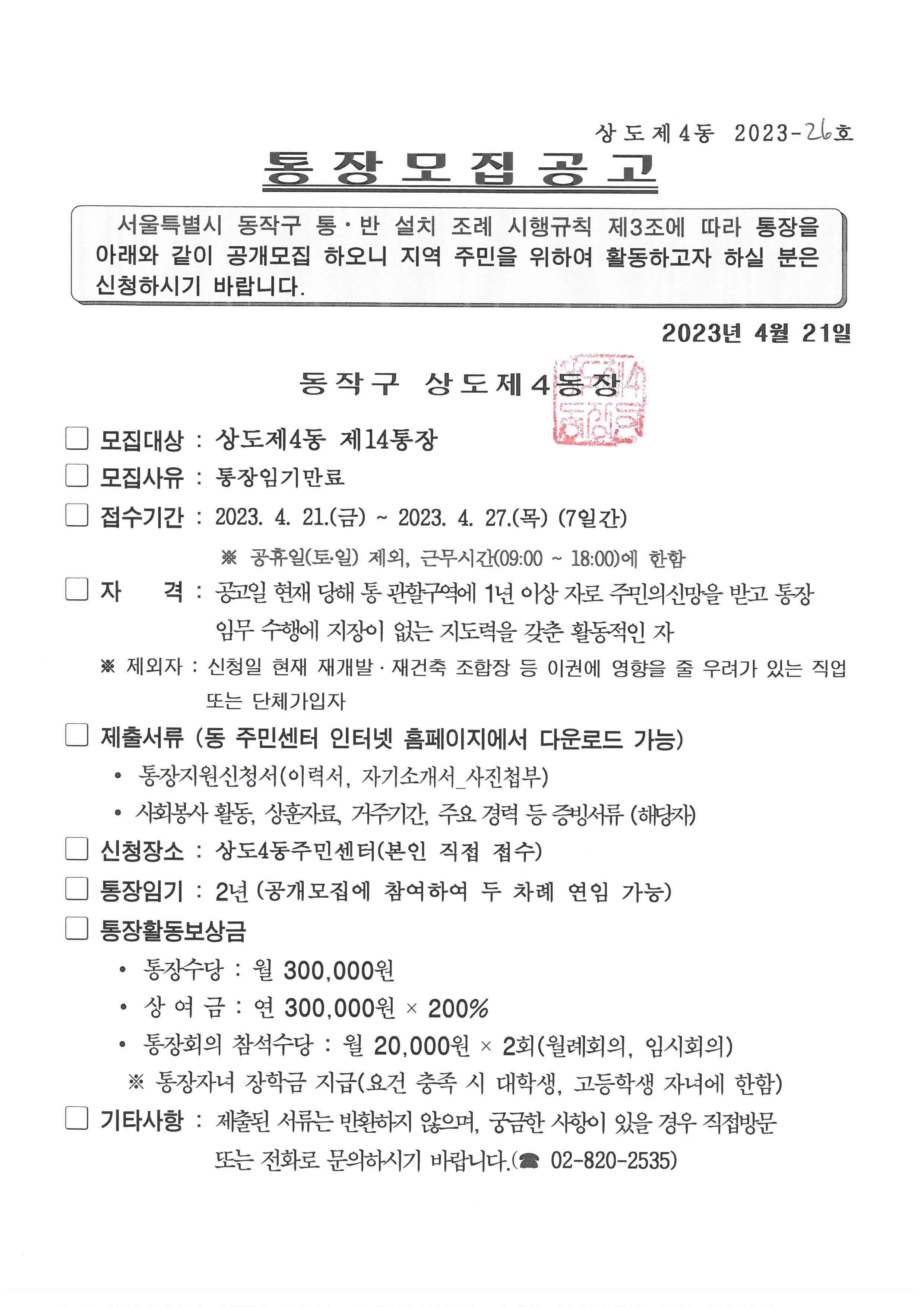 통장 공개모집 공고(14통)