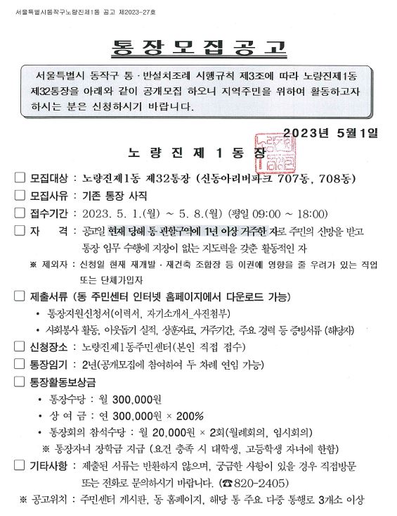 노량진1동 통장모집 공고(32통)
