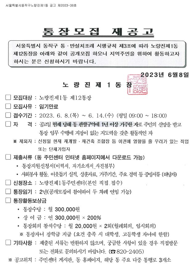 노량진1동 통장 모집 재공고(12통)