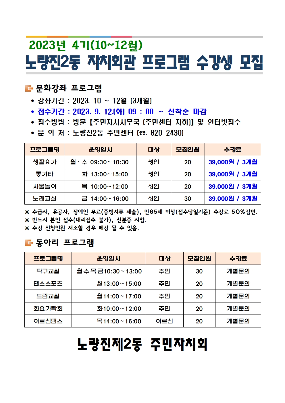 2023. 4기 노량진2동 자치회관 프로그램 접수 안내