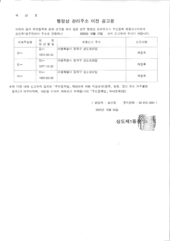 주민등록 거주불명자 행정상 관리주소 이전 공고 1차