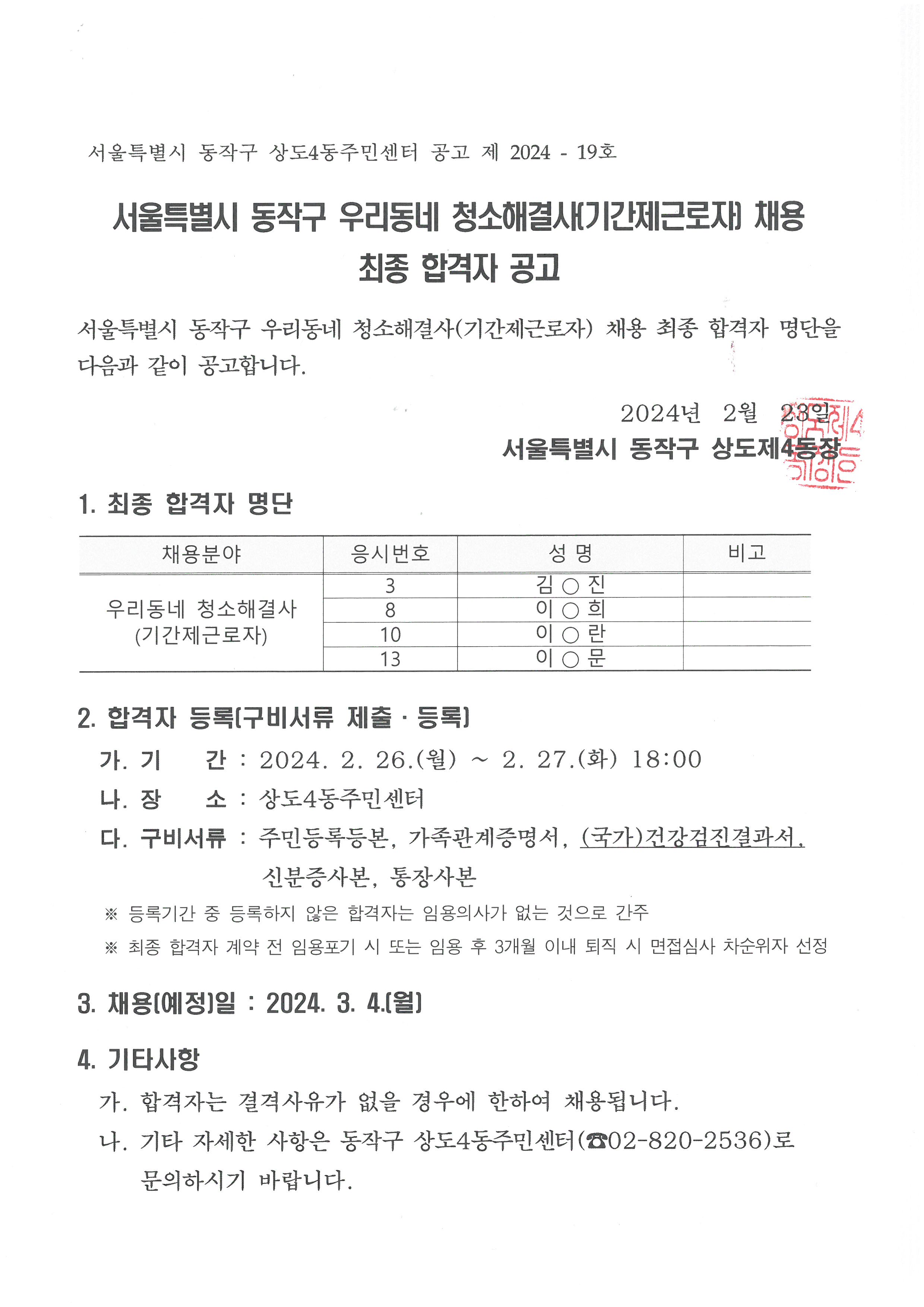 서울특별시 동작구 우리동네 청소해결사(기간제근로자) 채용 최종 합격자 명단을 다음과 같이 공고합니다.