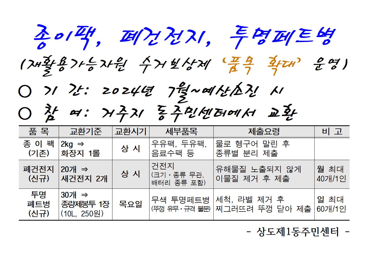 재활용가능자원 수거보상제 ‘품목 확대(종이팩, 폐건전지, 투명페트병)’ 운영 안내