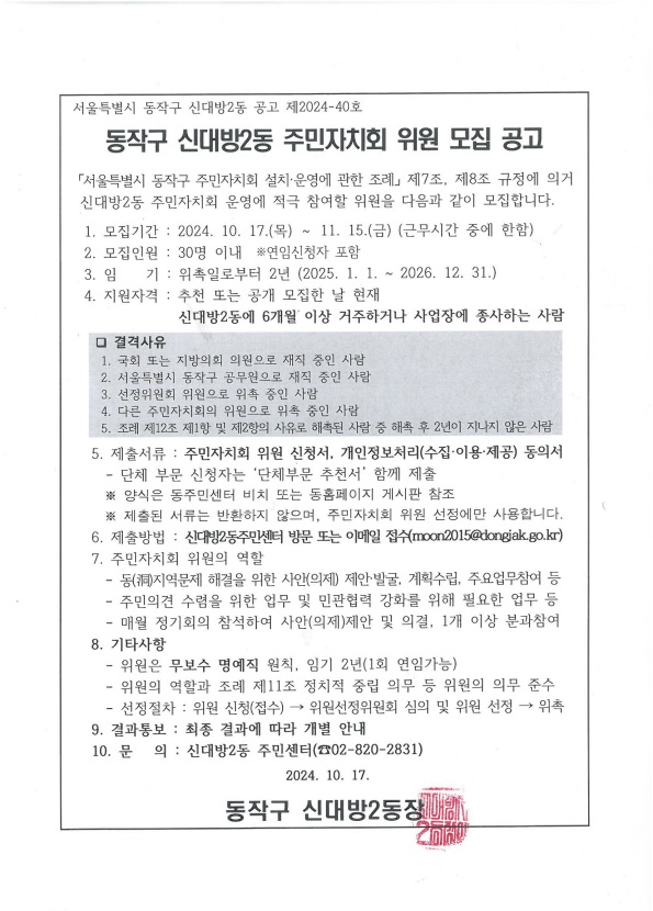 동작구 신대방2동 주민자치회 위원 모집 공고