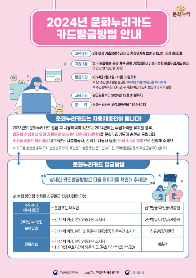 전국 문화예술·관광·체육 관련 가맹점에서 이용 가능한 문화누리카드 발급