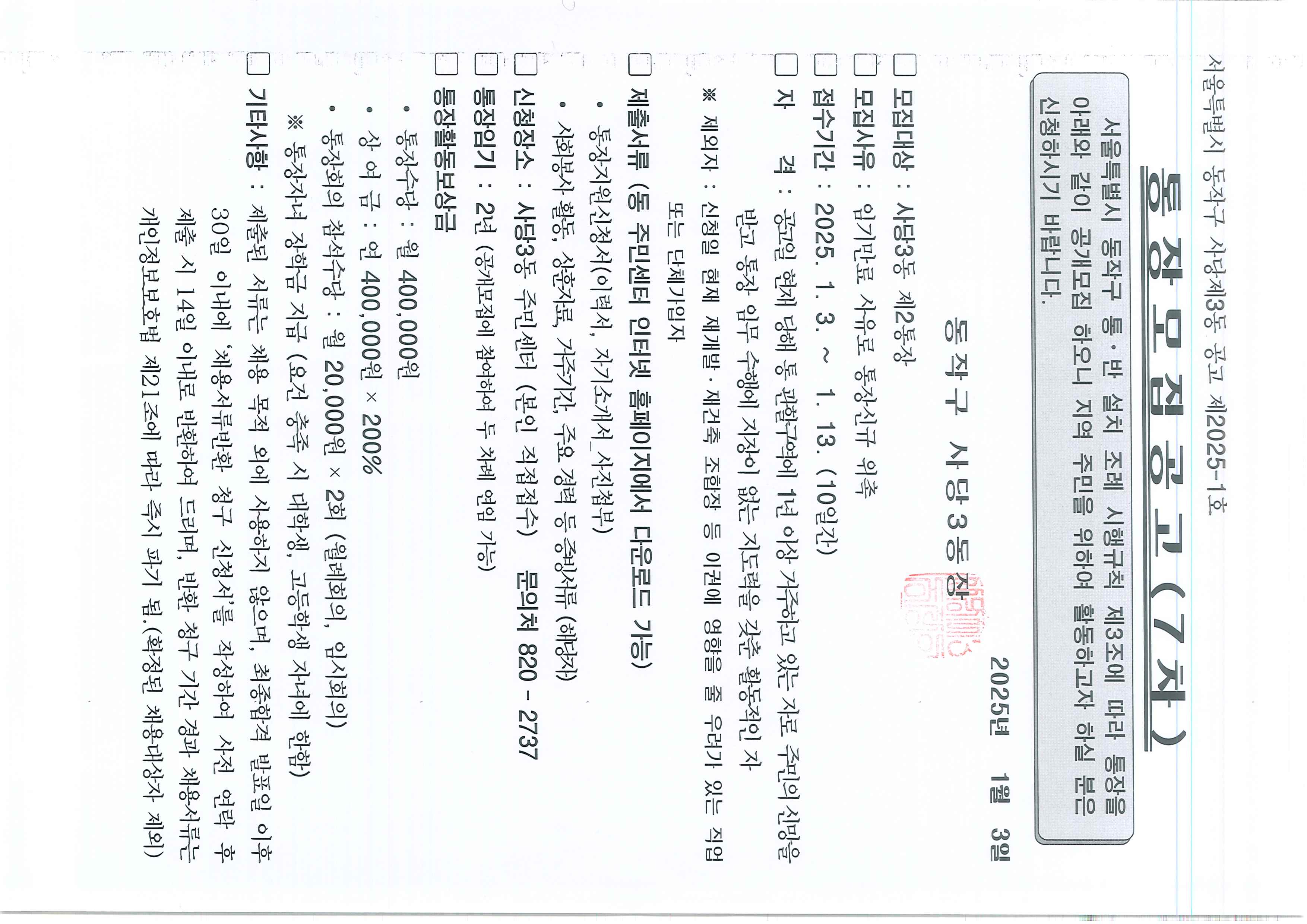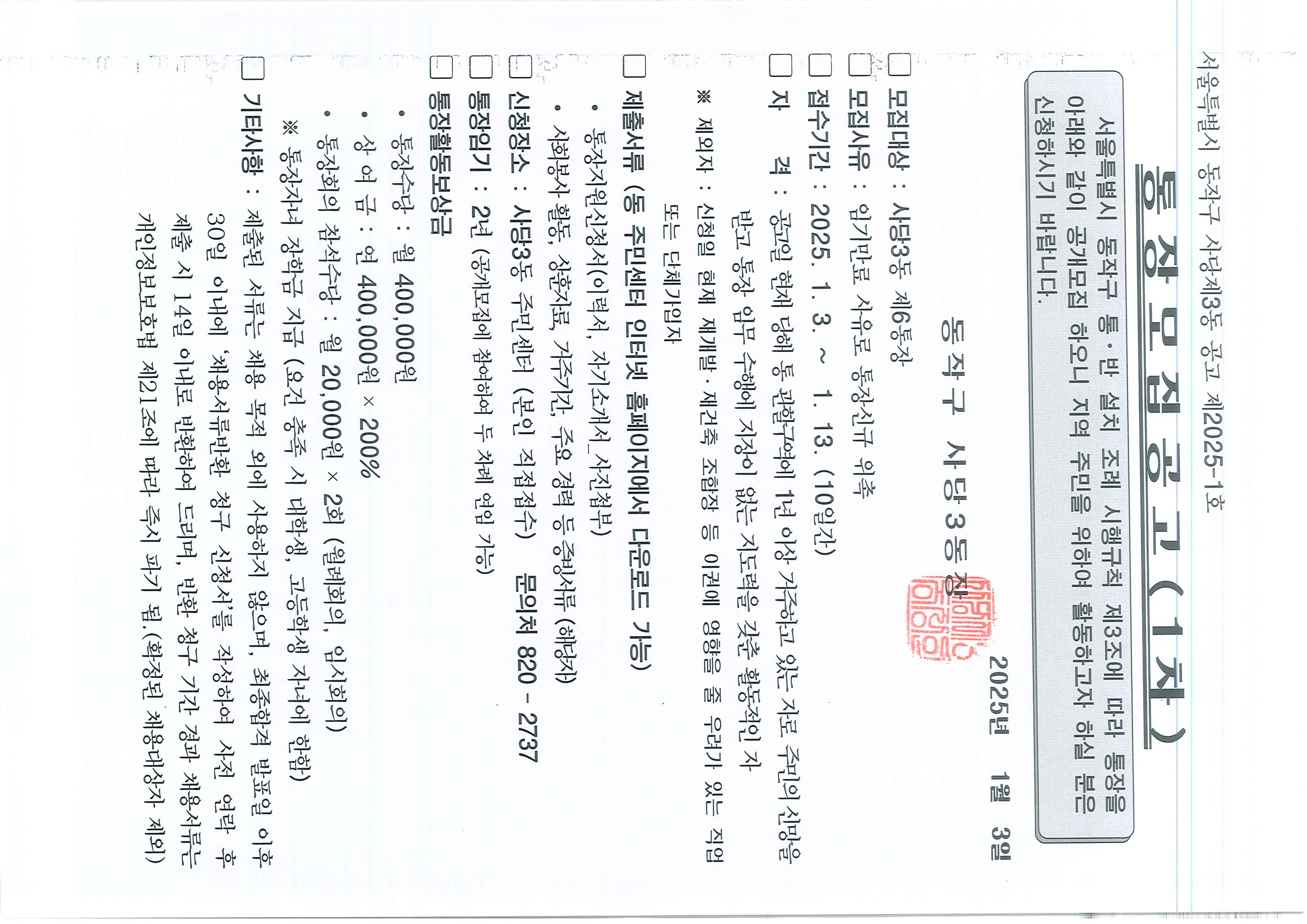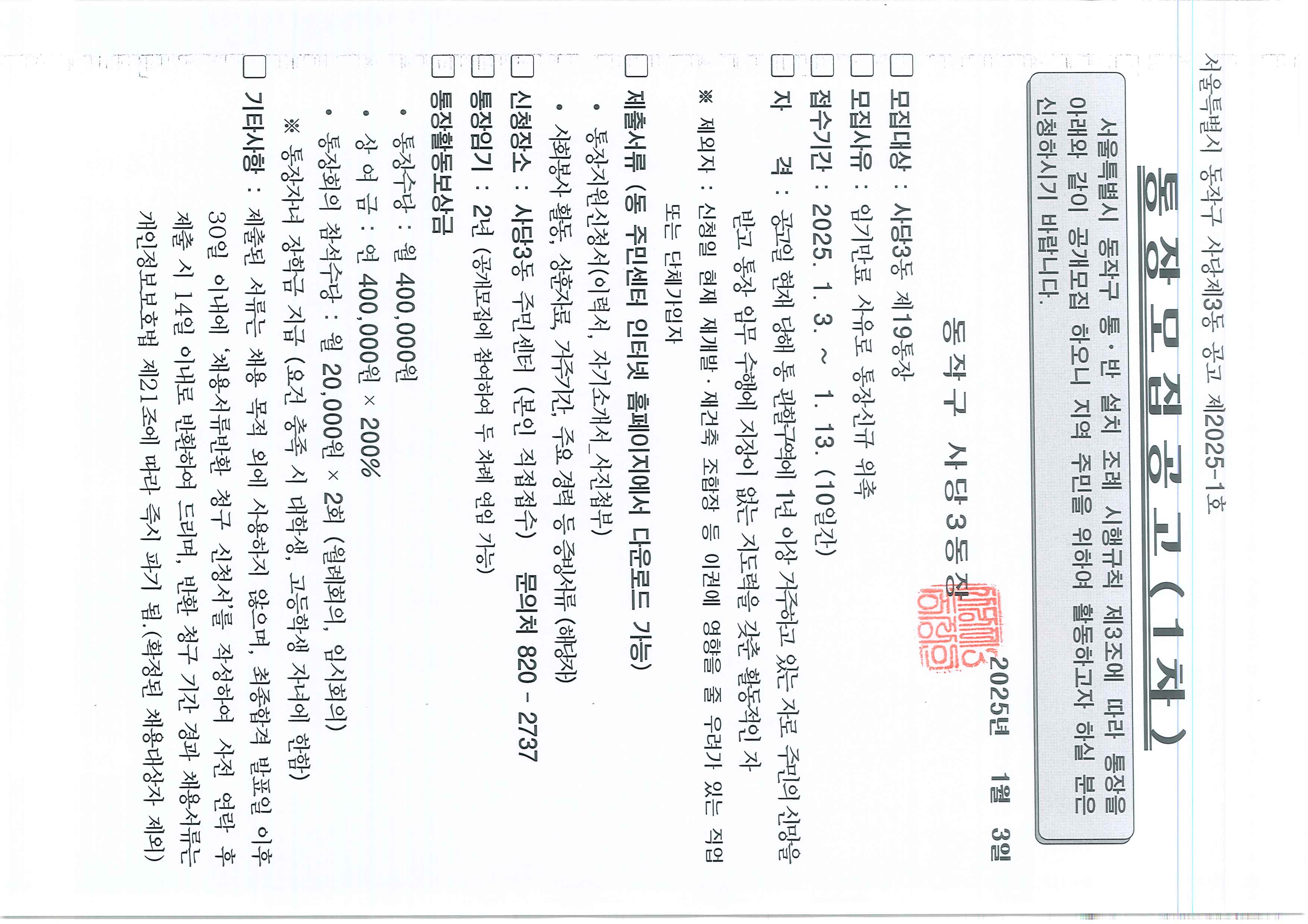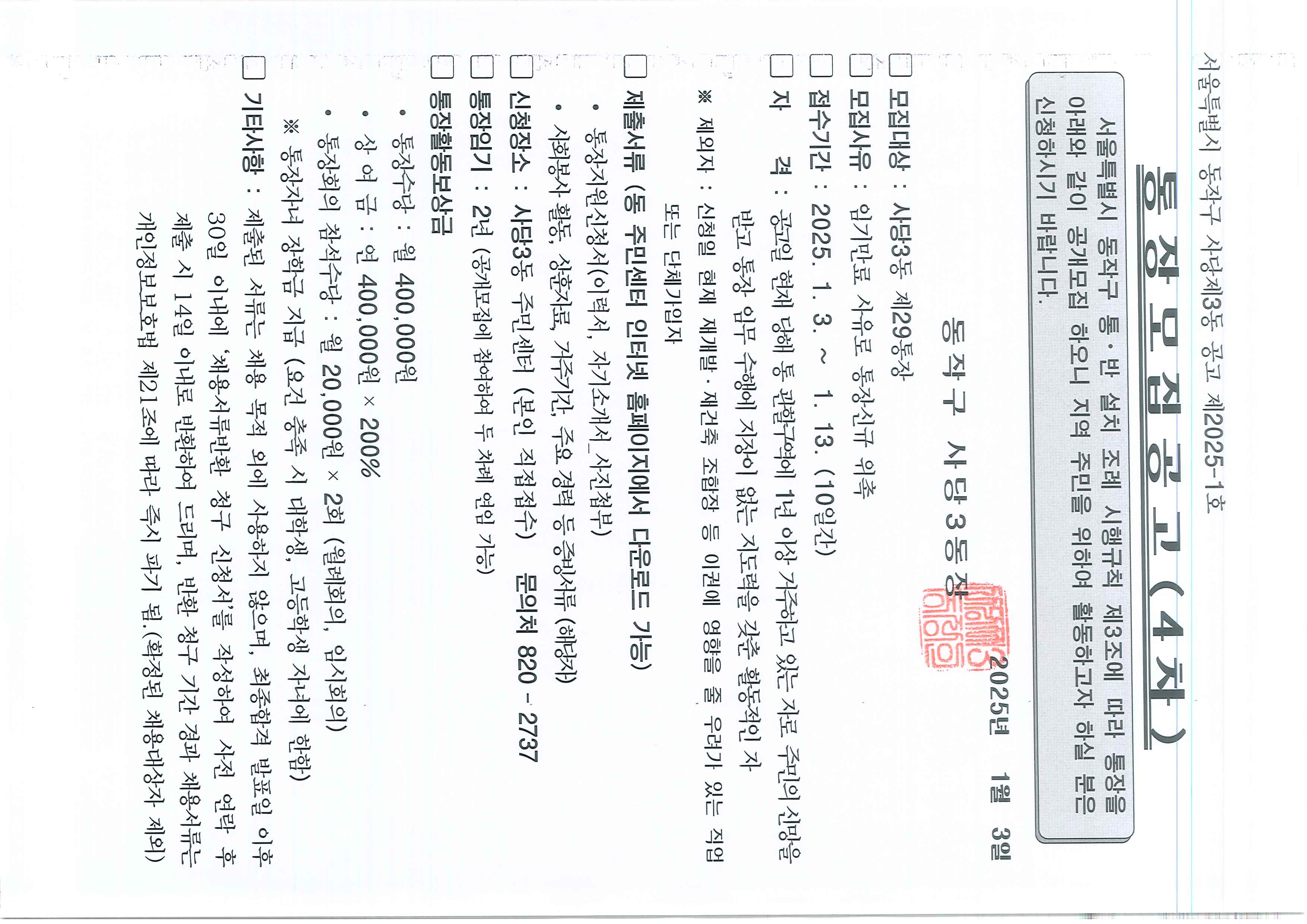 사당3동 통장 모집 공고(2통, 6통, 19통, 29통, 35통)