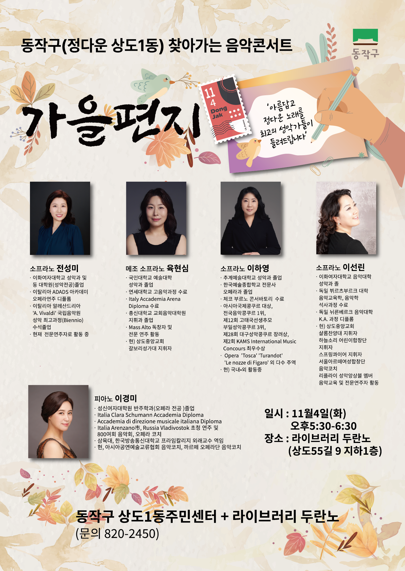 "정다운 상도1동 찾아가는 음악콘서트 - 가을편지"(가곡음악회) 개최 안내