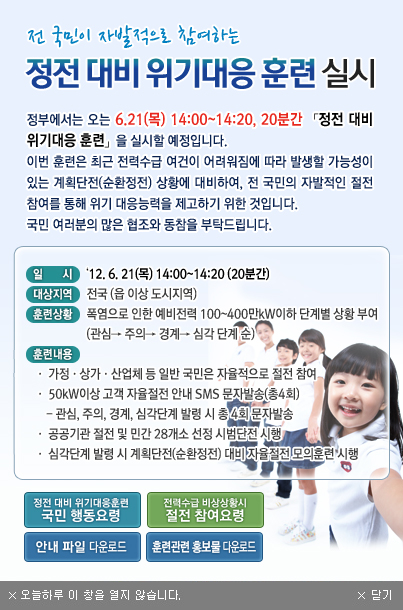 6.21(목) 정전대비 전력위기 대응훈련을 오후 2시부터 20분간 실시하오니 동참해 주시기 바랍니다.