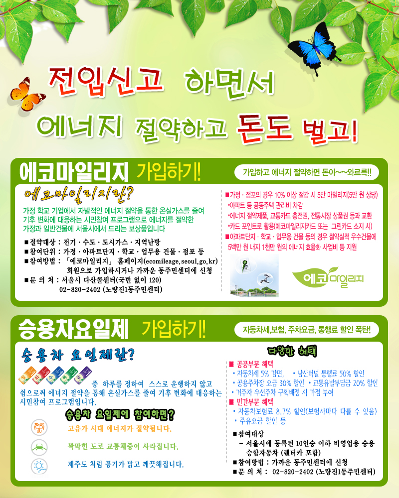 이 일환으로, 에코마일리지 가입 및 에너지클리닉 서비스 진단, 승용차 요일제 등 에너지 절감을 위한 사업을 추진하고 있습니다.